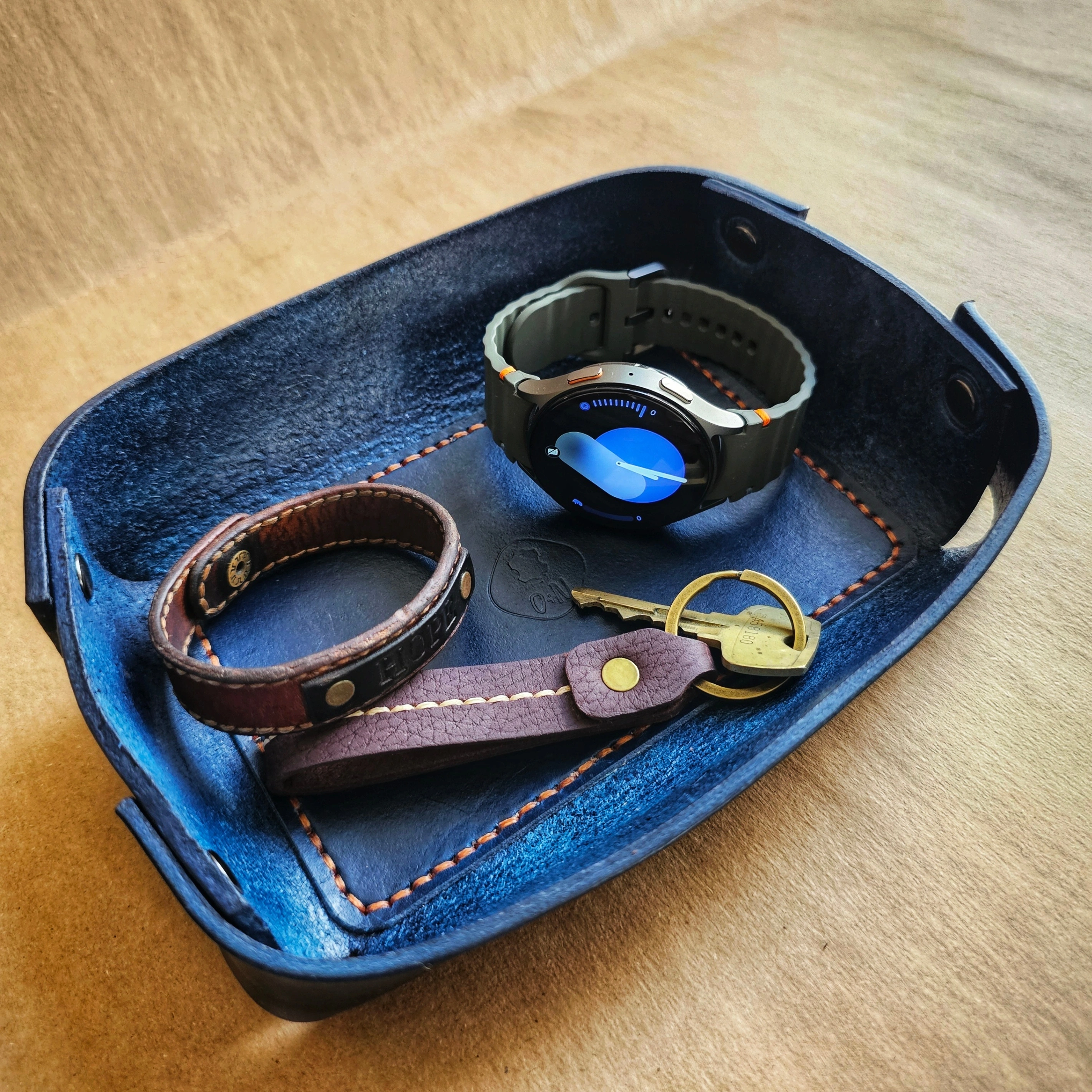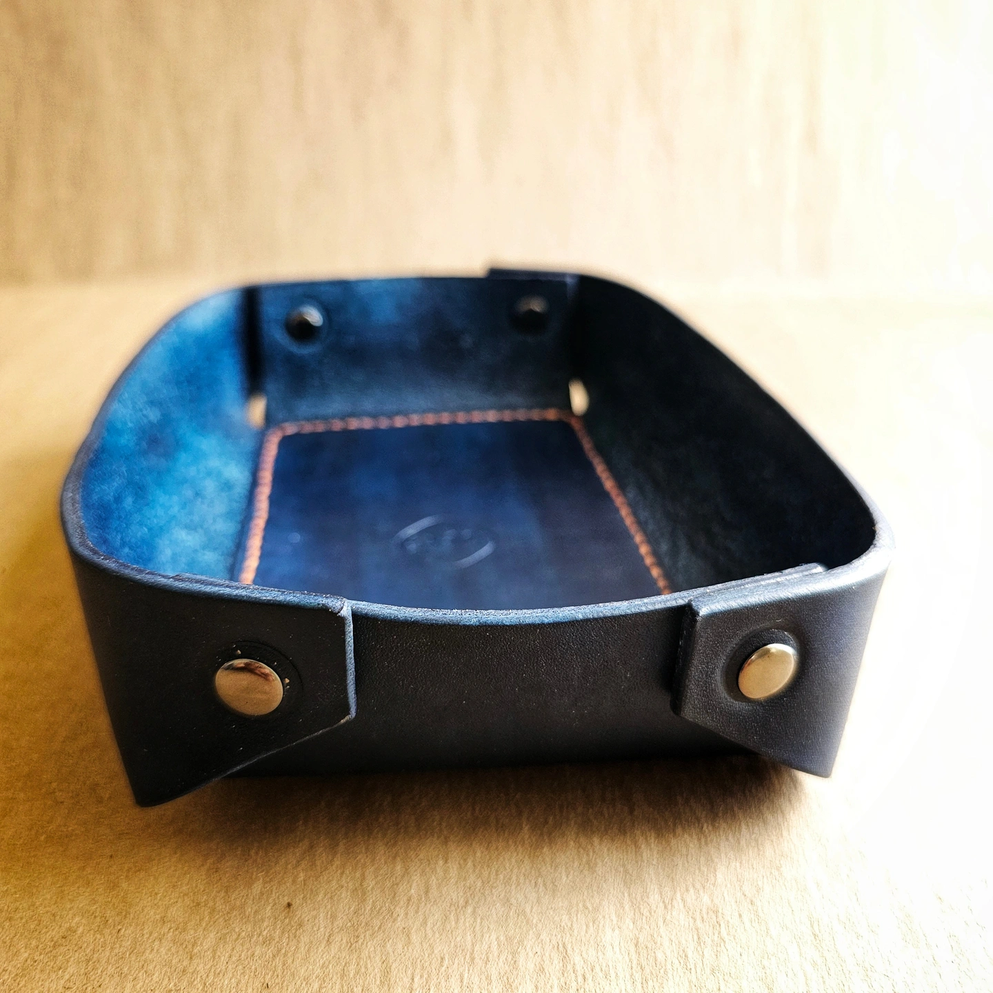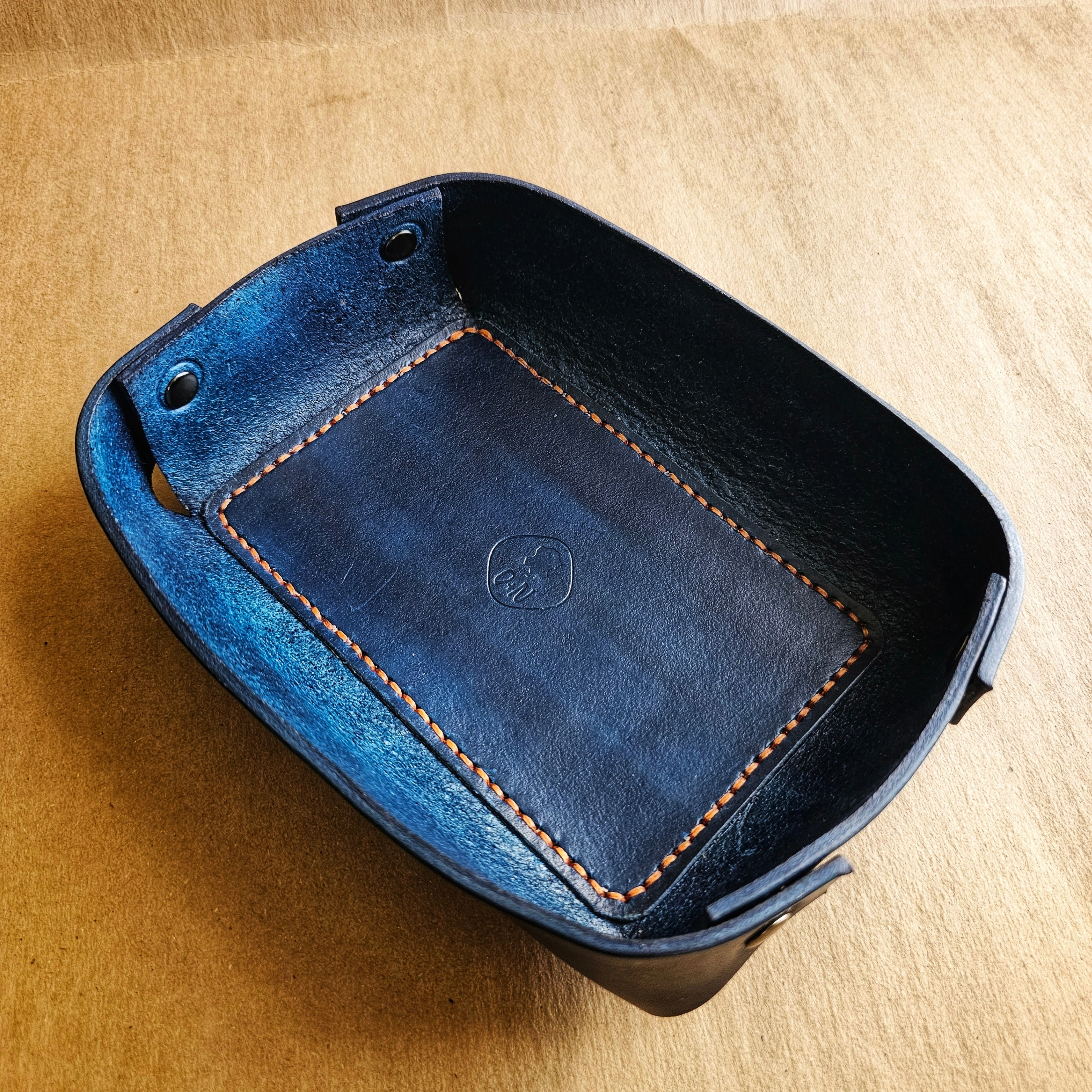 Size: Approx. 19 cm x 15 cm This leather tray is hand-cut and hand-dyed in a rich royal blue, using thick vegetable-tanned leather. It's a great way to keep your everyday carry or jewelry organized and looking great in one spot. **Please note that due to the hand-dyeing process, the color may vary slightly between each batch**