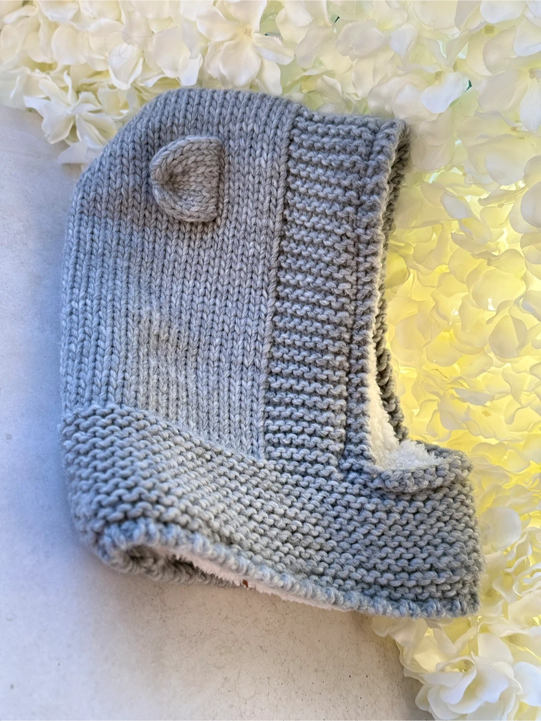 Selling a cute, hand-knitted grey balaclava! It has adorable little ears on top. The material is soft and cozy, perfect for keeping your little one warm during the colder months. It's in great condition and ready for a new home!