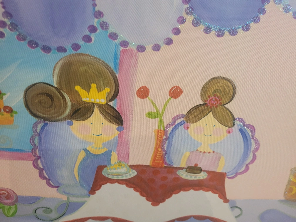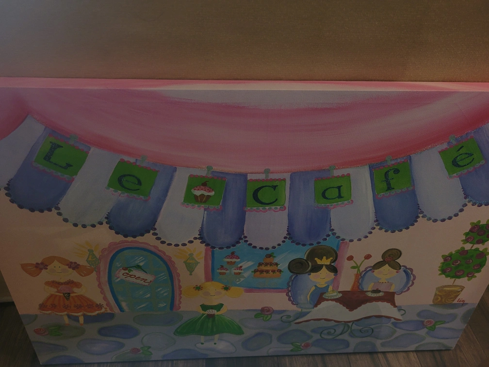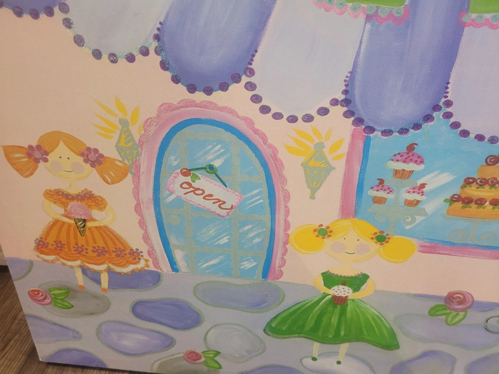This is a super cute, hand-painted canvas art piece, perfect for a child's room or playroom! It features a sweet cafe scene with little girls and yummy treats. It's in great shape and ready to brighten up any space
