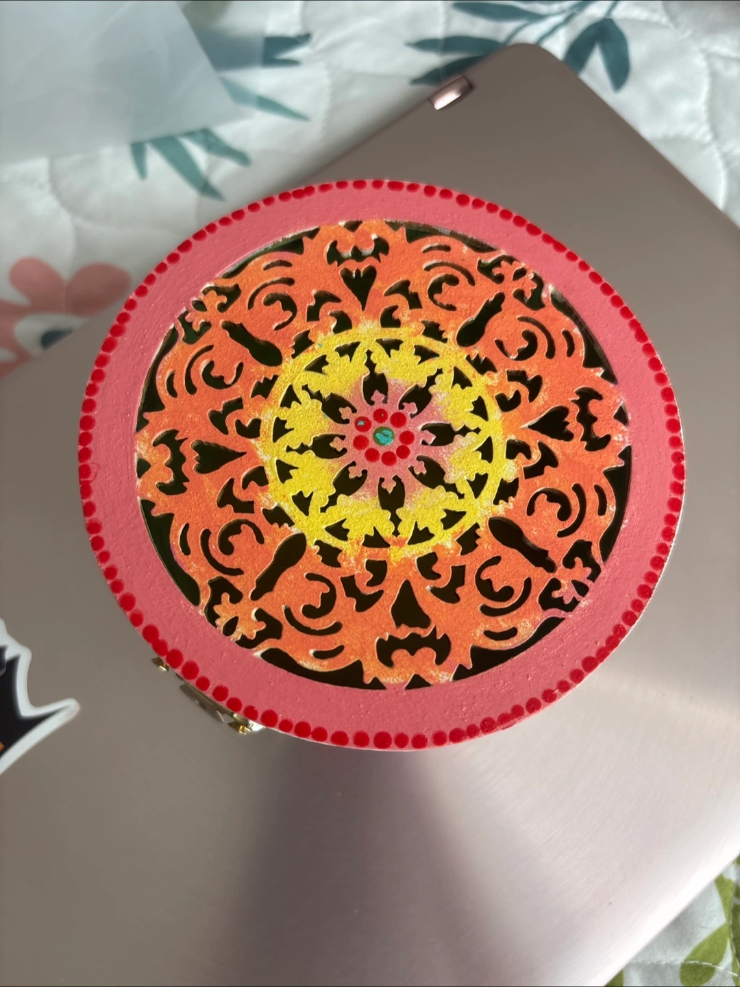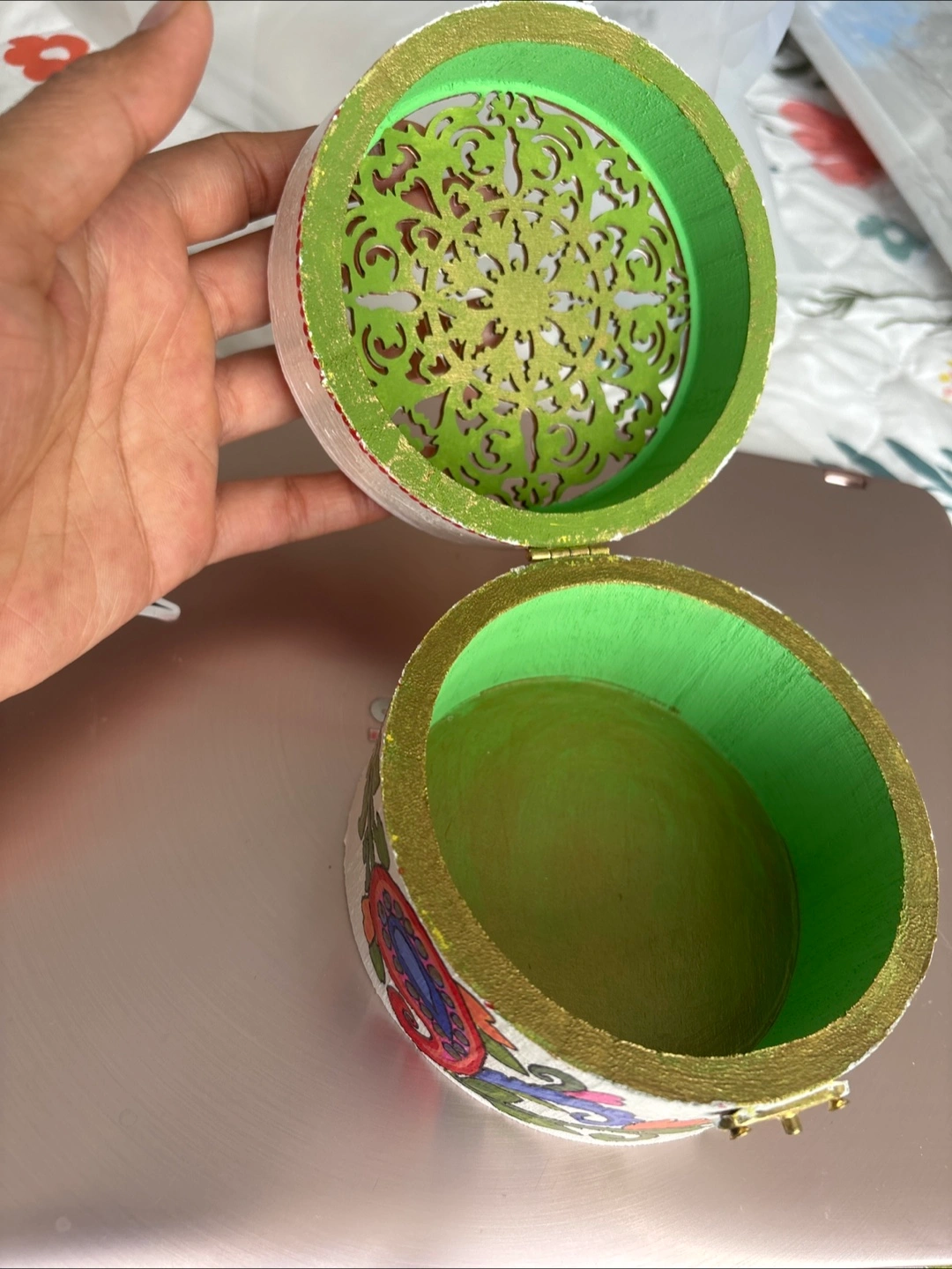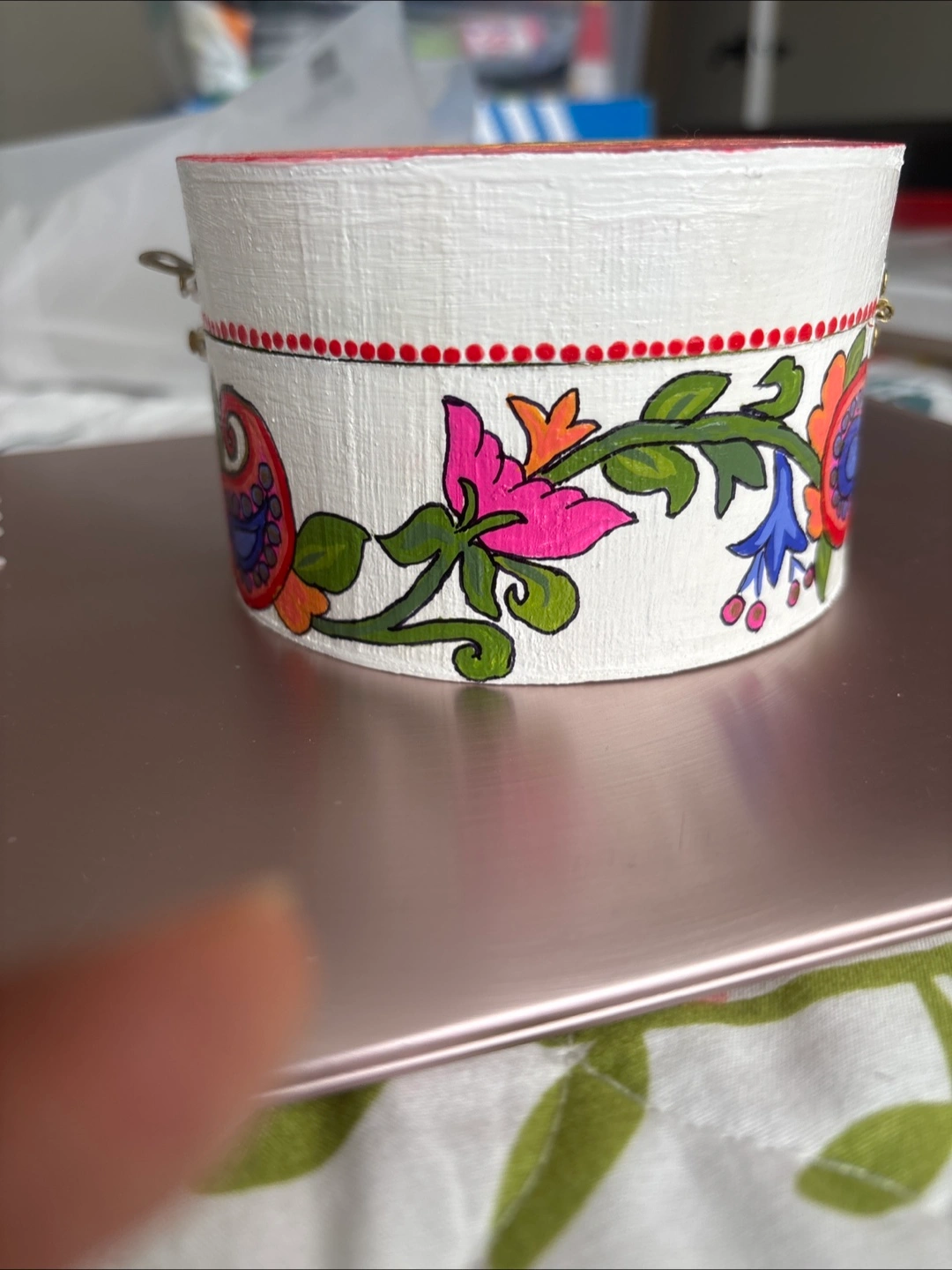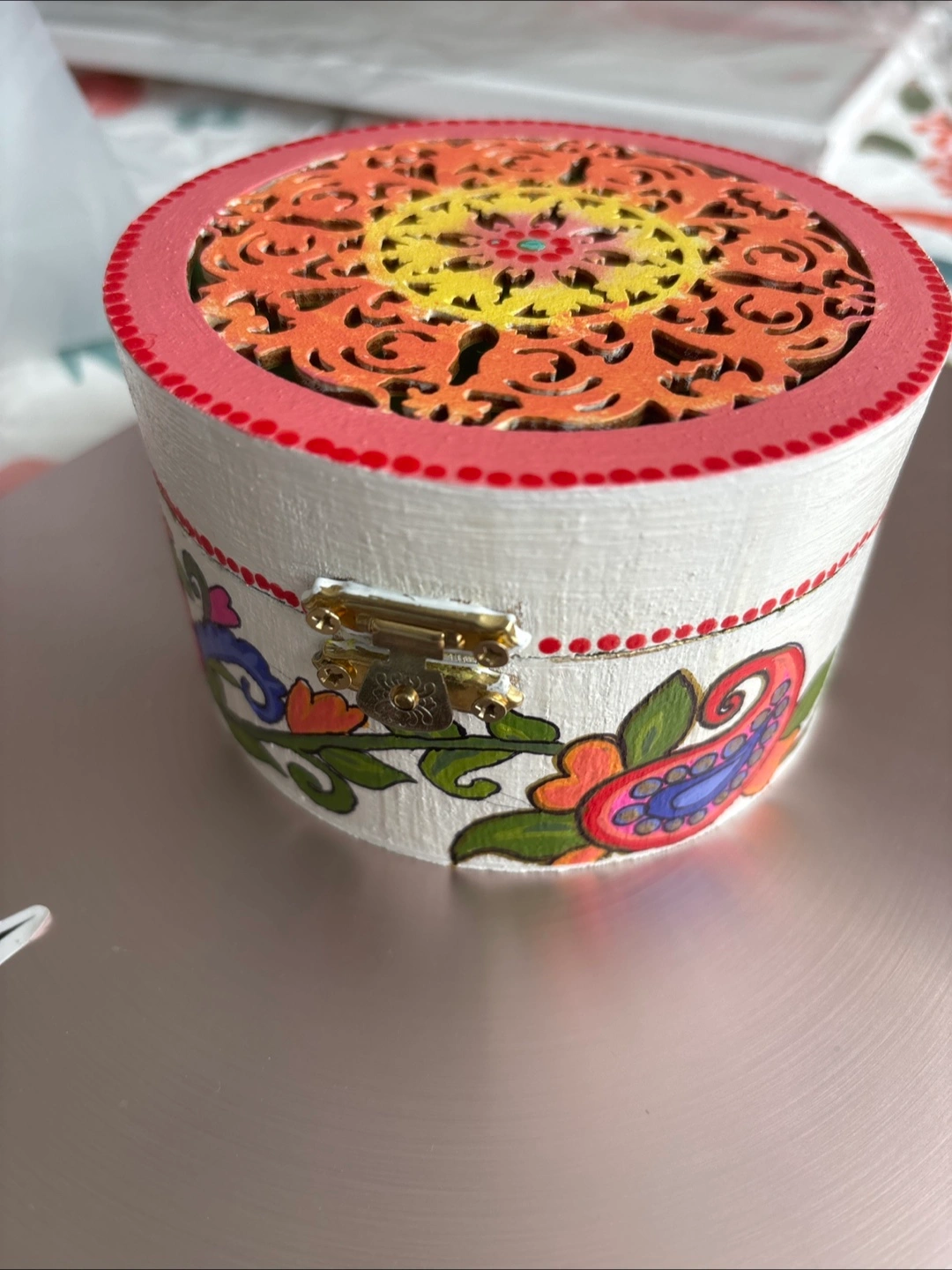 Selling a cute, handpainted wooden decorative jewelry box! It's round and features a unique floral design. The inside is painted a vibrant green. It would be perfect for storing small trinkets/ jewelry pieces or adding a touch of charm to any room