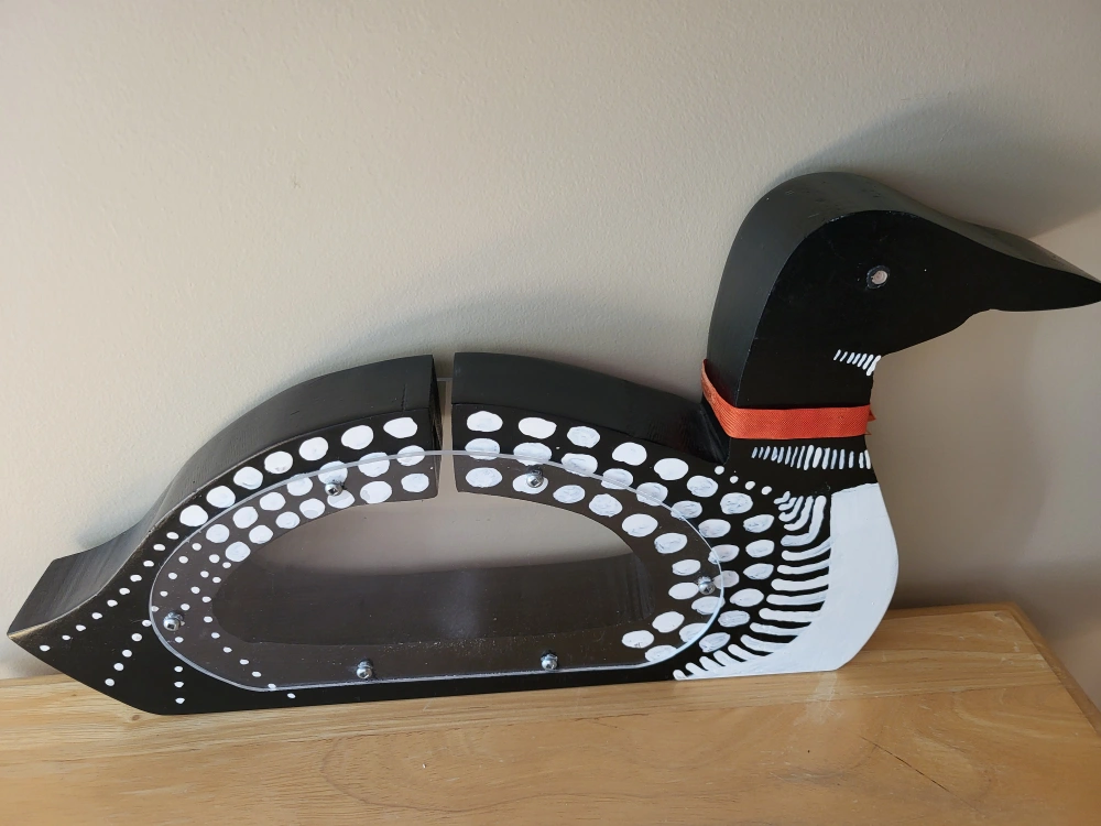 Here's a charming, handcrafted loon coin bank! It's perfect for adding a touch of Canadiana to any room. The black and white design is eye-catching, and the clear plastic window lets you see your savings grow. It's in great condition and ready for a new home 13" Check out my other ads I offer discounts when buying from multiple ads. PU on Worthington off St Annes or Whyte Ridge. Delivery $5-$10 in Wpg