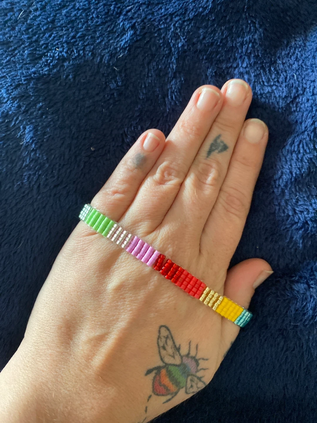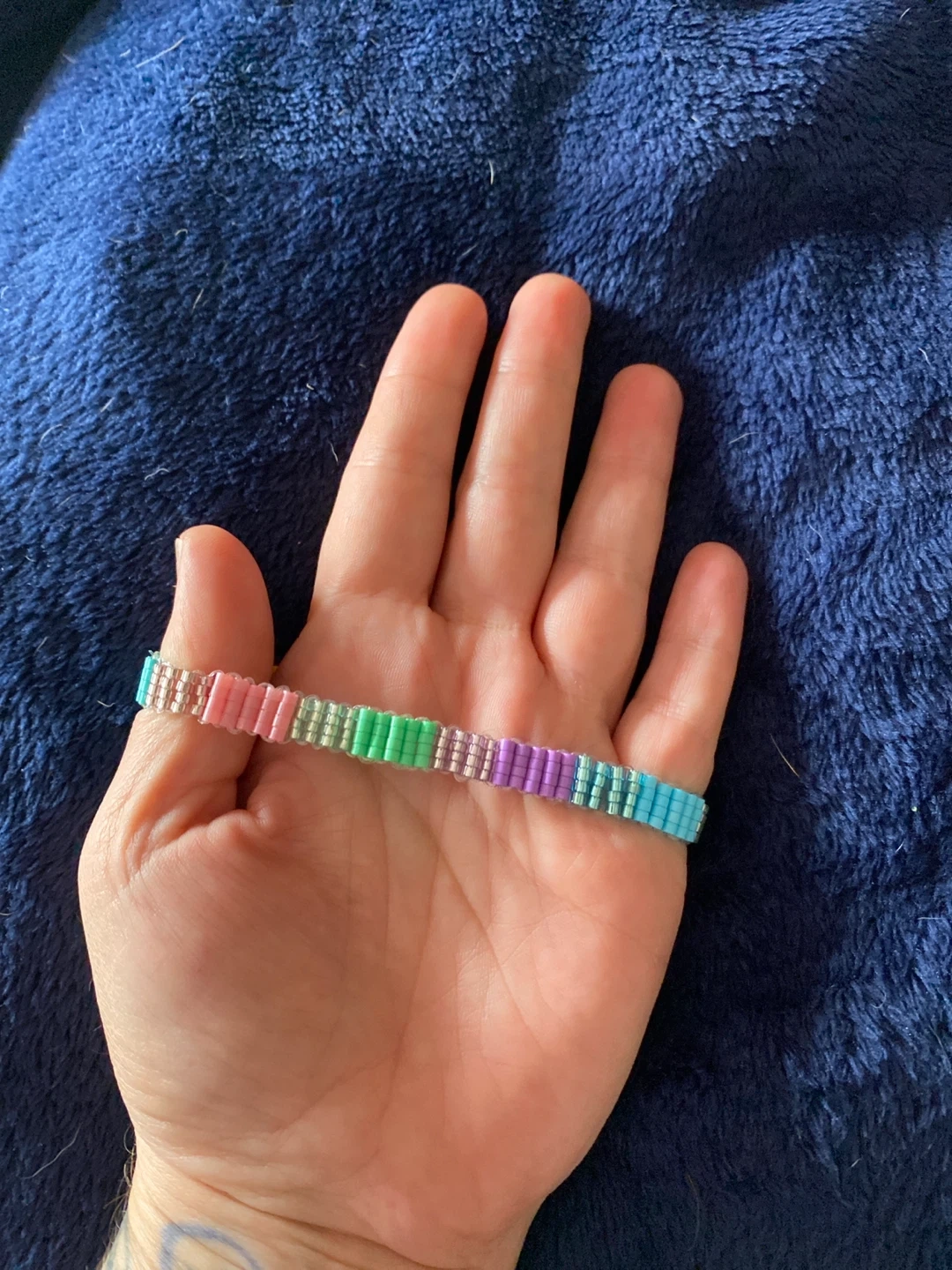 Selling a handmade beaded bracelet! It's a unique piece with a colourful rainbow design. Perfect for adding a pop of colour to your outfit!