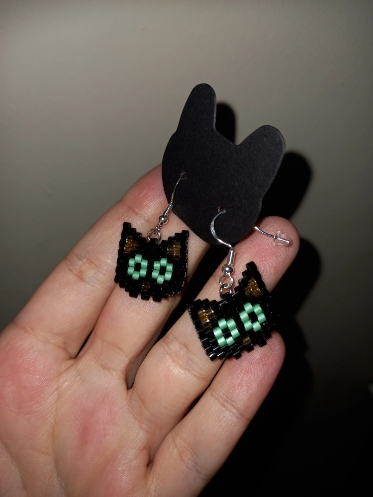 These are a pair of handmade beaded earrings. They are shaped like little black cats with green eyes. Super cute and unique! Good for Halloween ๐