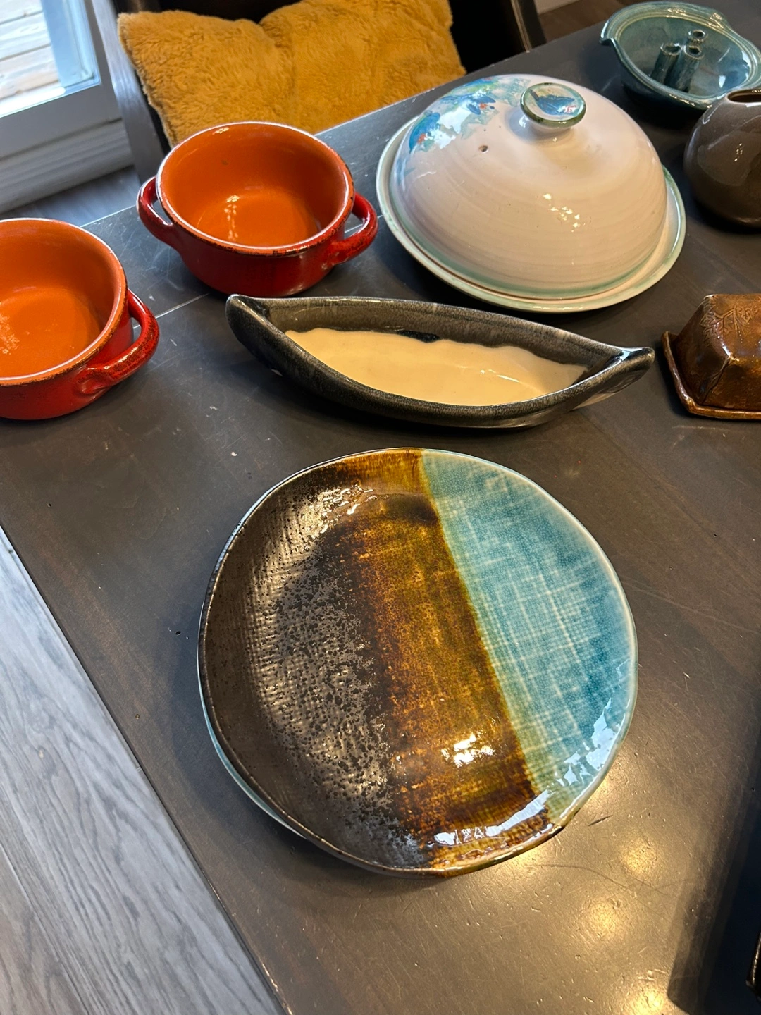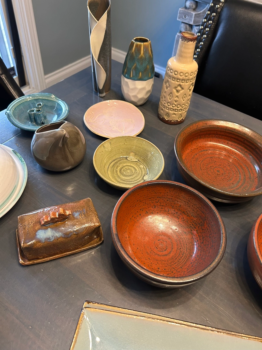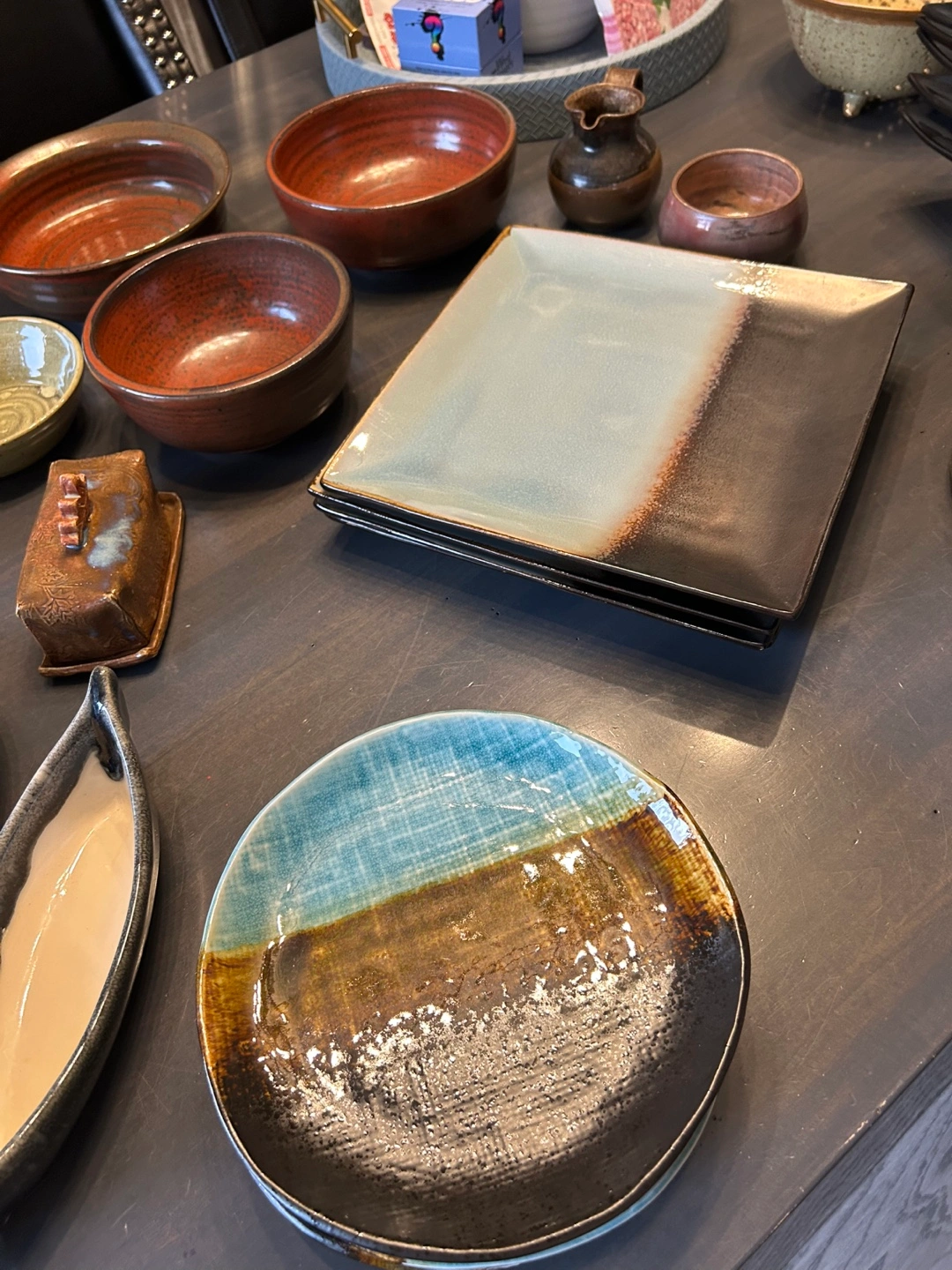 A collection of unique, handmade ceramic bowls, plates, and cups. These items feature a variety of earthy tones and textures, perfect for adding a rustic touch to your kitchen or dining area. Each piece has its own character and charm, making them a lovely addition to any home