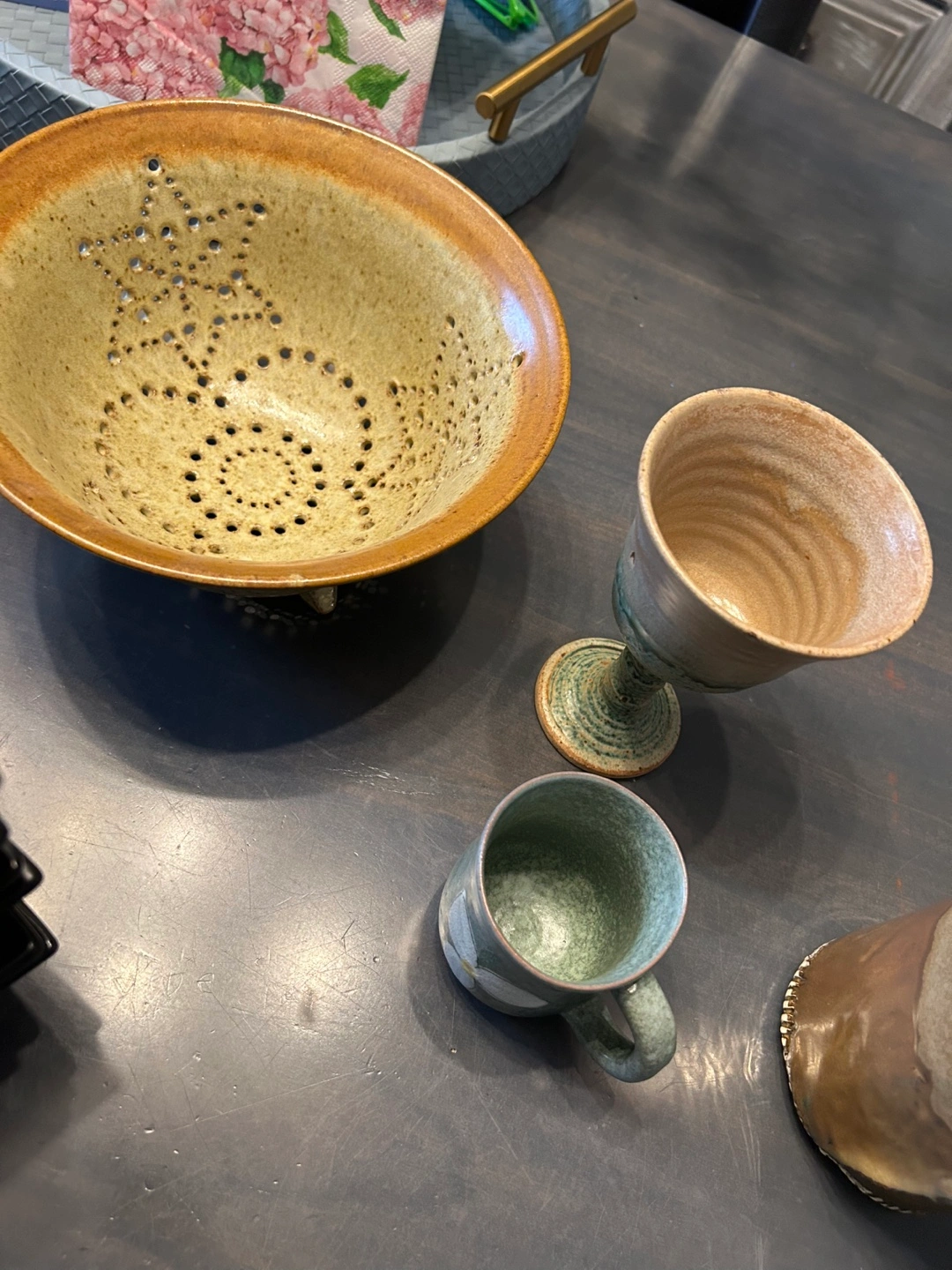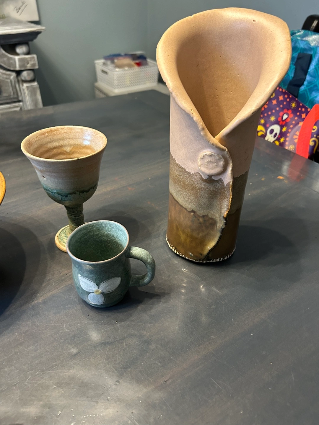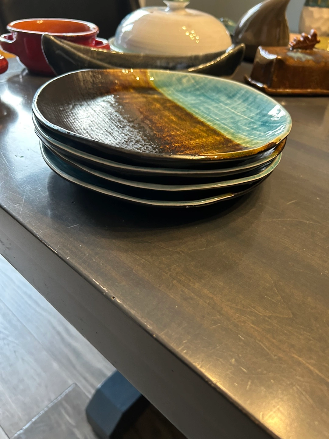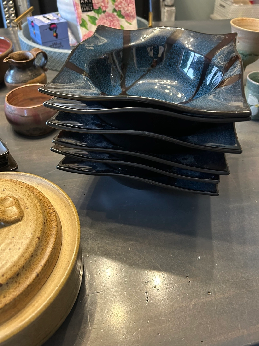 A collection of unique, handmade ceramic bowls, plates, and cups. These items feature a variety of earthy tones and textures, perfect for adding a rustic touch to your kitchen or dining area. Each piece has its own character and charm, making them a lovely addition to any home