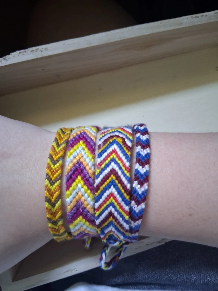 Selling a set of 4 handmade friendship bracelets. They feature a colourful chevron pattern. Perfect for sharing with friends or stacking them up. as well as for prizes for children!