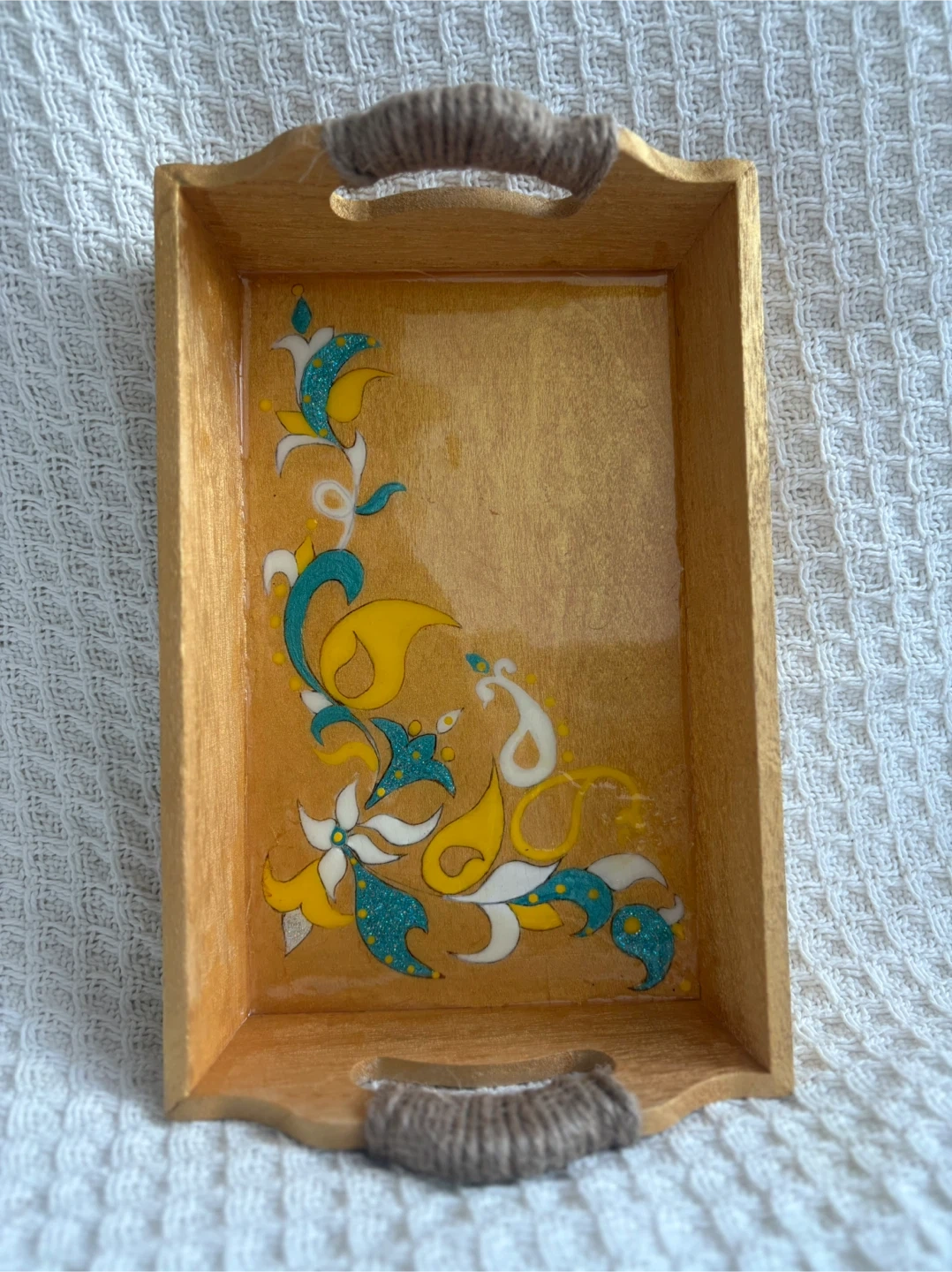 This is a handmade decorative wooden tray. It has a unique floral design in yellow, teal, and white. Perfect for adding a touch of handmade charm to your home!