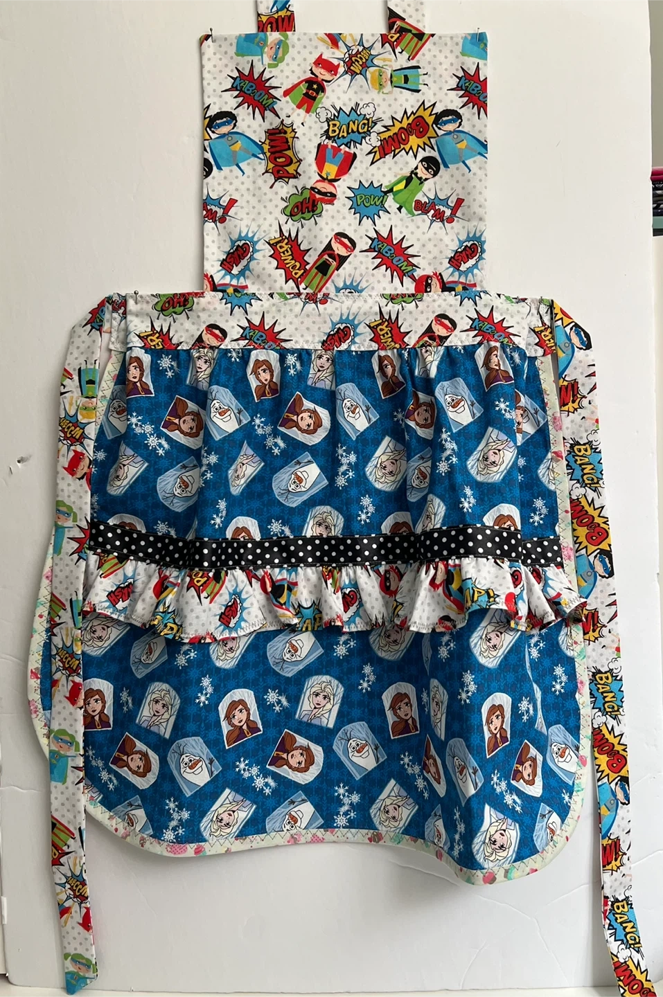 This is a handmade apron with a Disney Frozen theme. It features a colourful heart pattern on the front and a blue border with Frozen characters. Perfect for any Frozen fan!