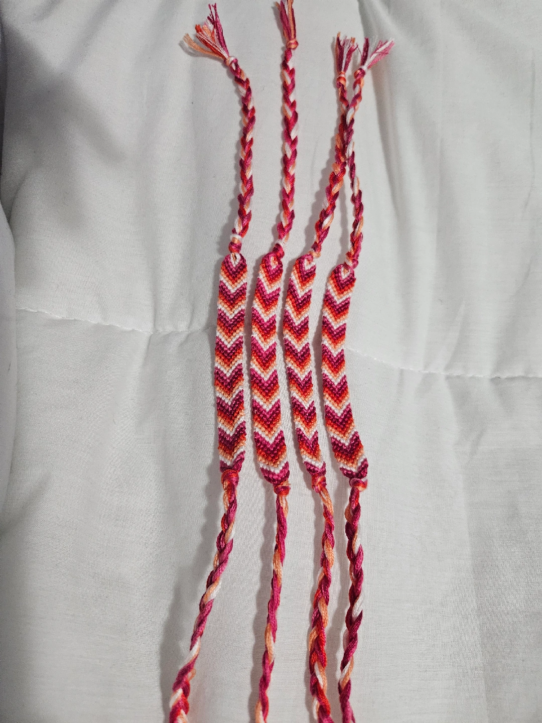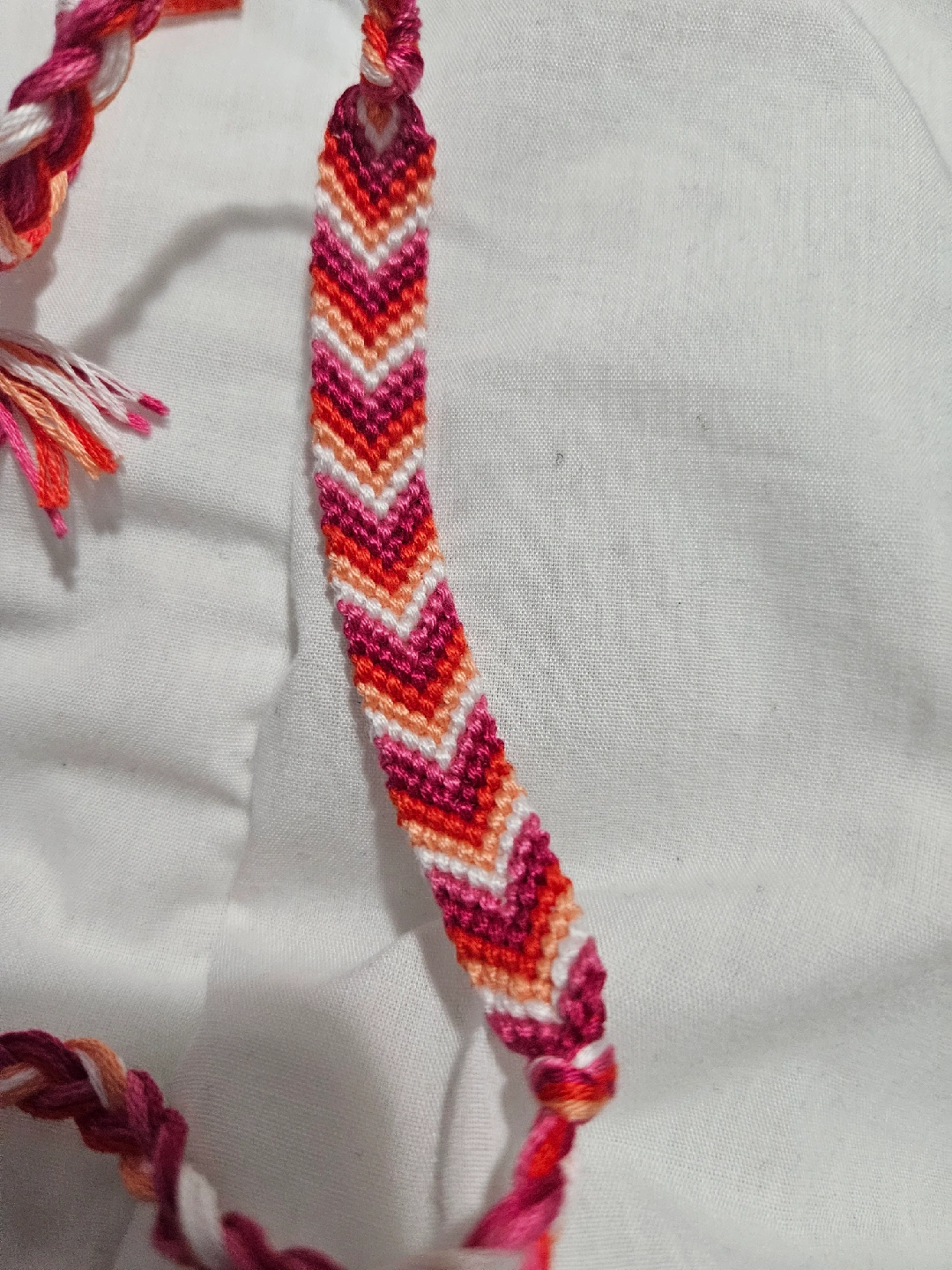 Selling handmade friendship bracelets with the lesbian flag design! They feature a lovely chevron pattern in shades of pink, orange, and white. Perfect for sharing with friends or stacking for a fun, colourful look.