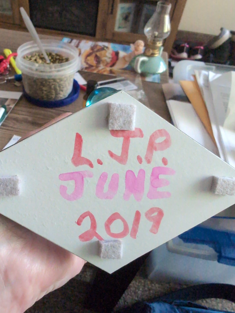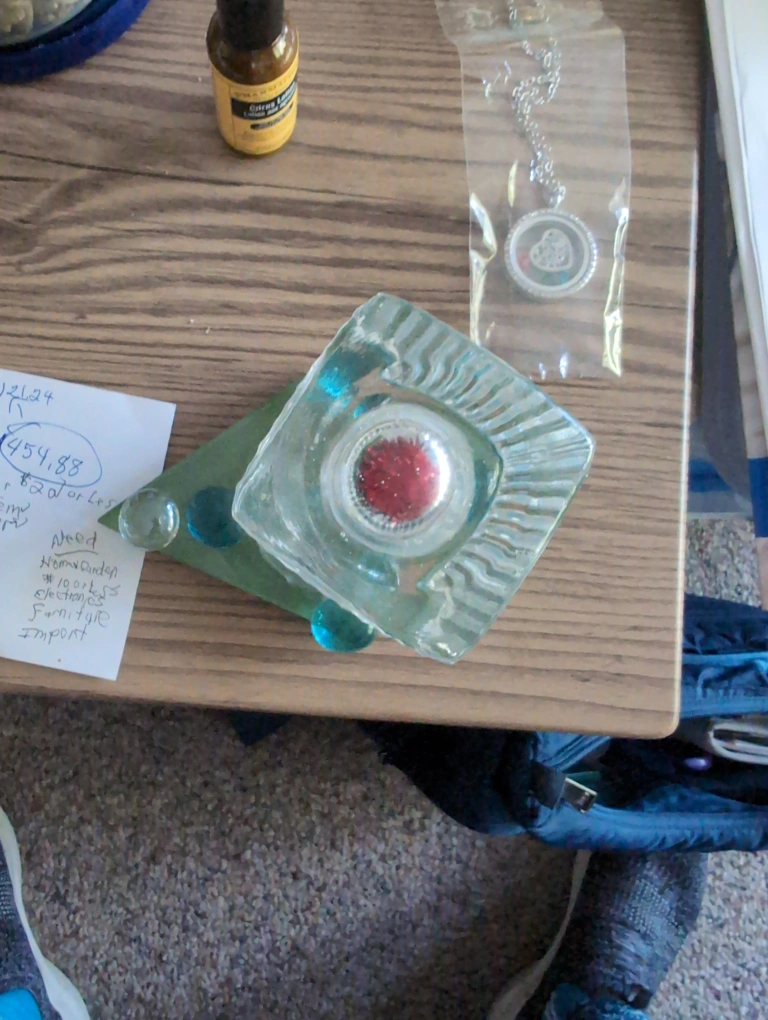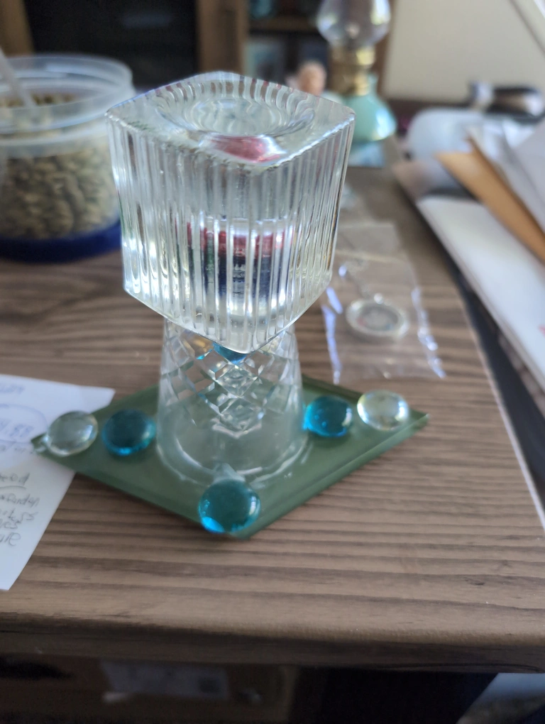 Selling a unique, handmade glass decor piece, featuring a glass cube top with a red centre, a decorative glass base, and is accented with blue and clear marbles. It's a charming piece of home decor that would add a special touch to any room