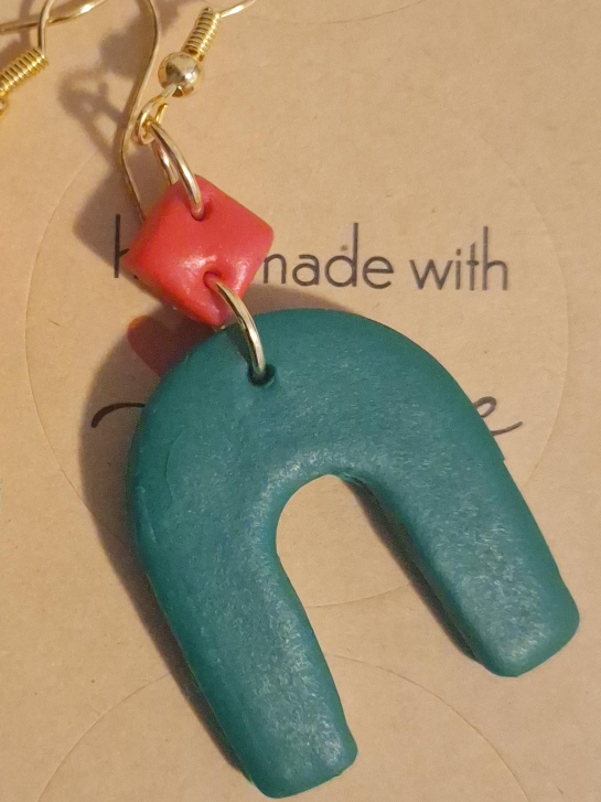 Unique handmade polymer clay earrings! These earrings feature a red square and a green arch shape. Perfect for adding a pop of colour to any outfit