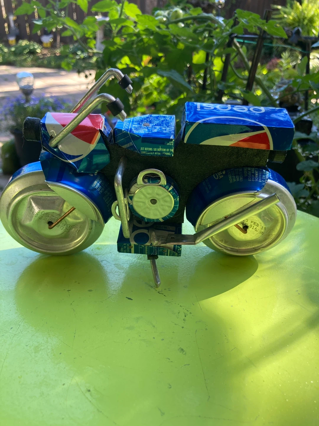 This unique motorcycle sculpture is crafted entirely from recycled soda cans! A fun and quirky piece of art, perfect for adding a touch of whimsy to any space