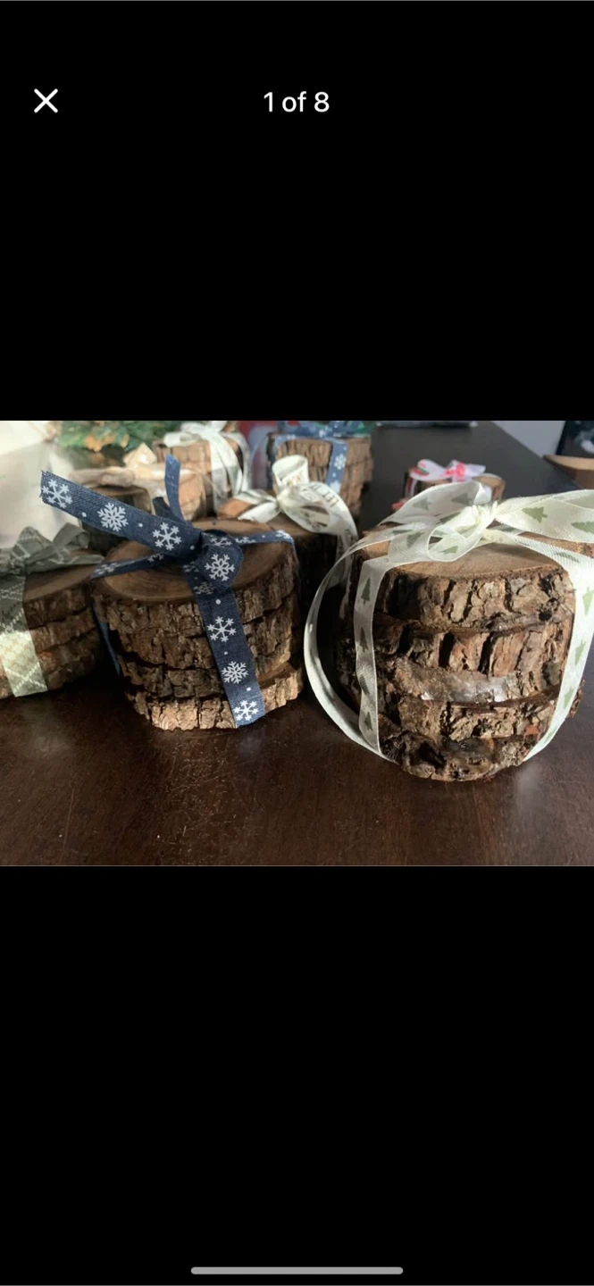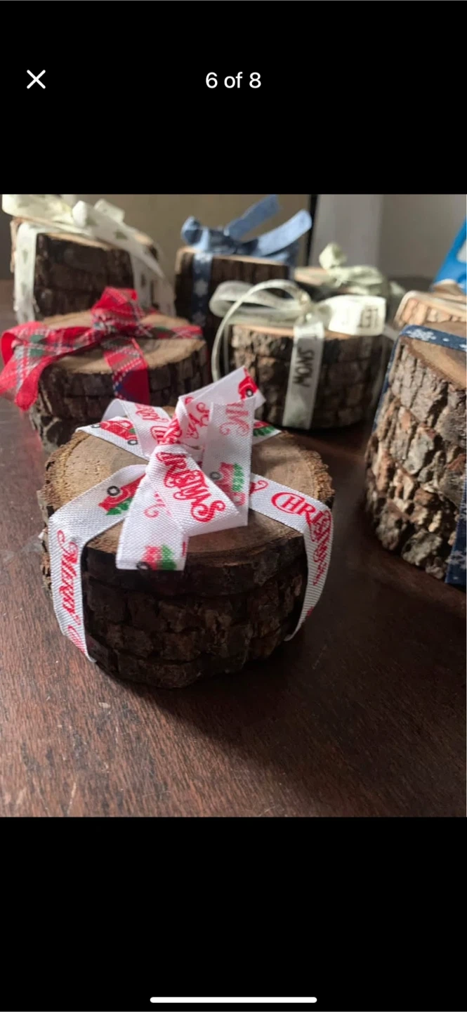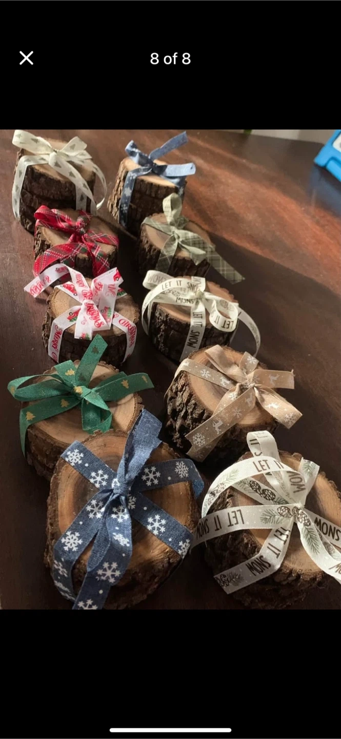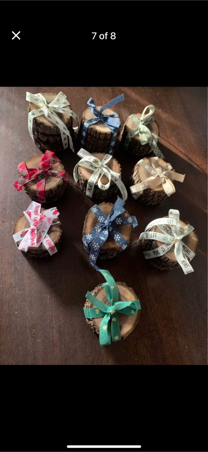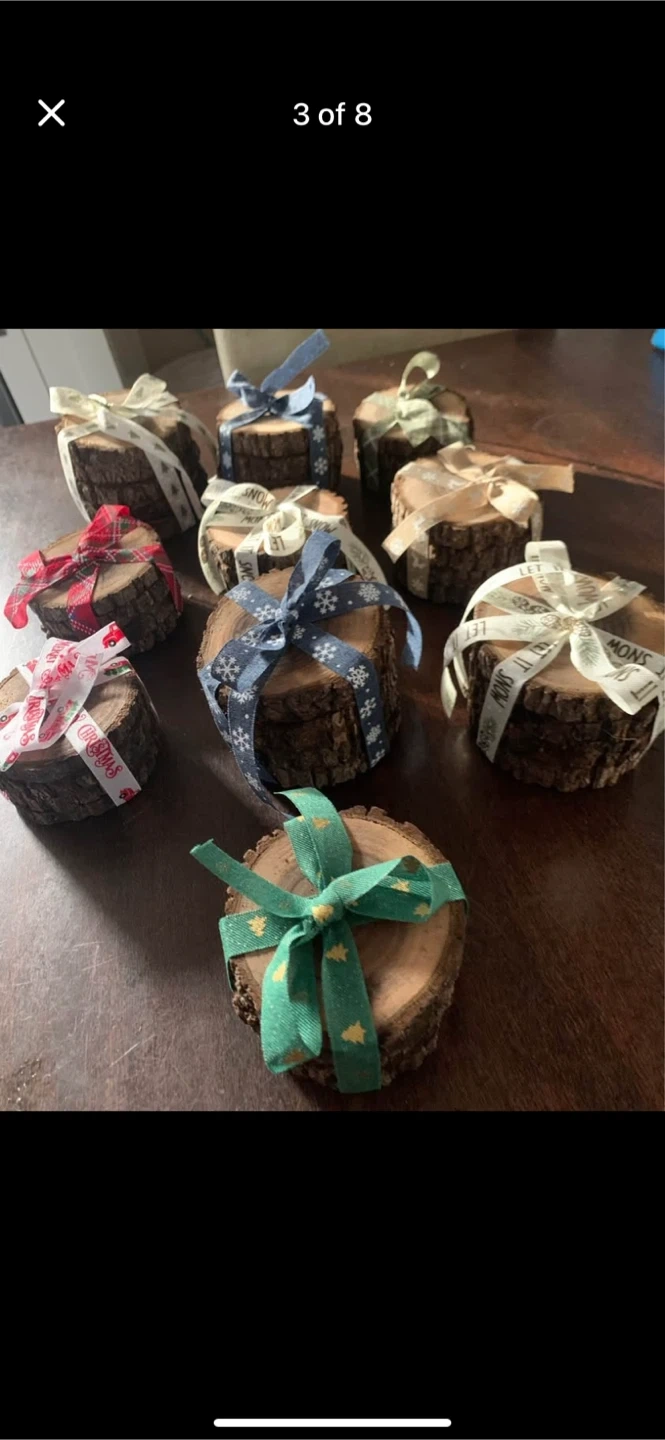 I'm selling a set of handmade wood slice Christmas coasters. They are decorated with festive ribbons in various colours and patterns. Perfect for adding a rustic touch to your holiday decor! $10 each