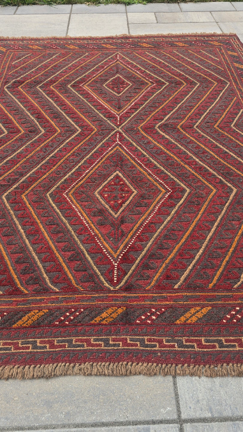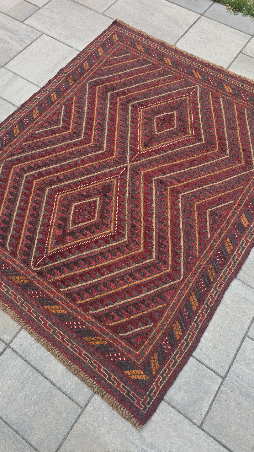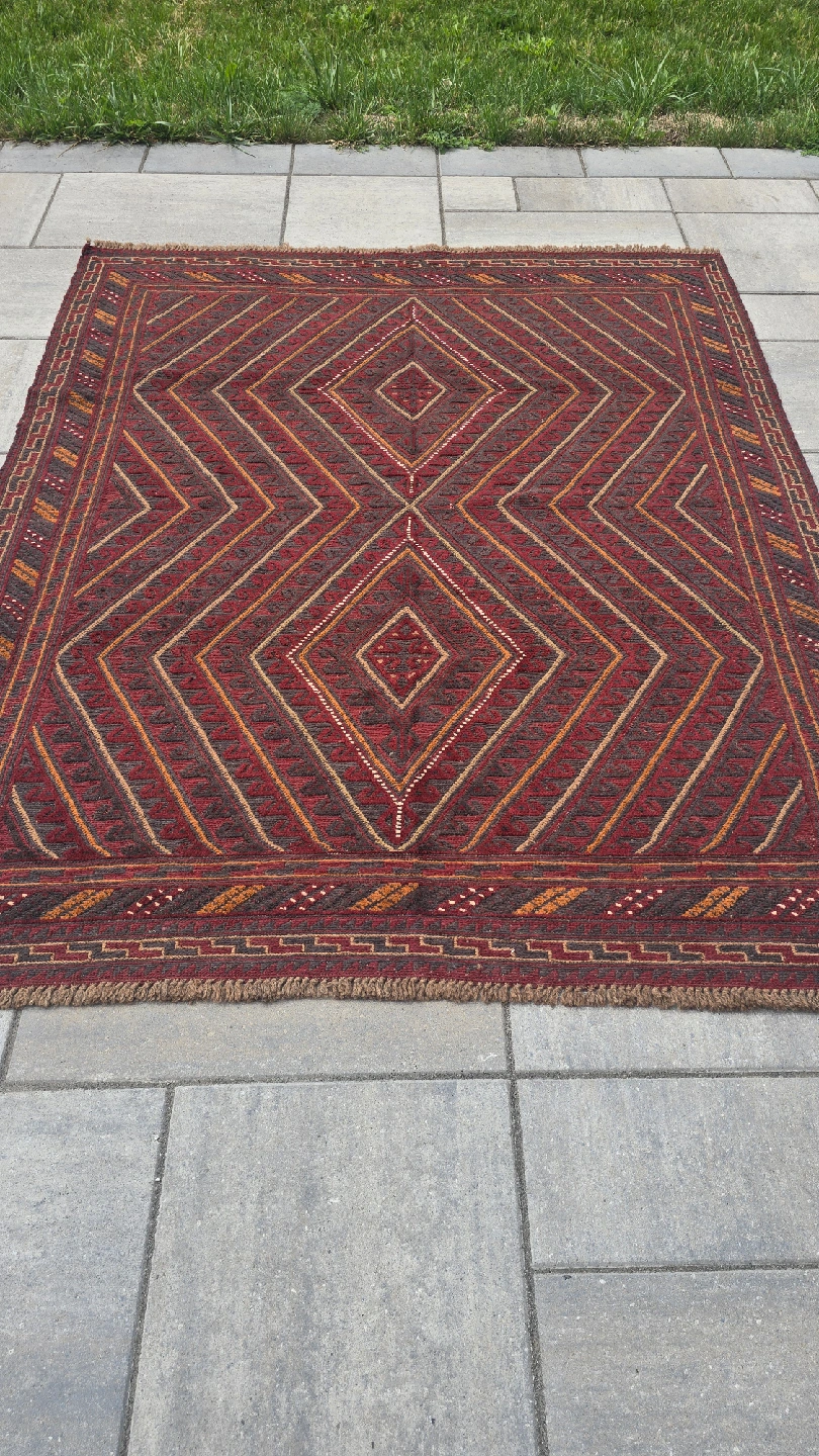This is a lovely area rug with a geometric diamond pattern in shades of red, brown, and tan. It would look great in any room of the house! The rug is in good condition.