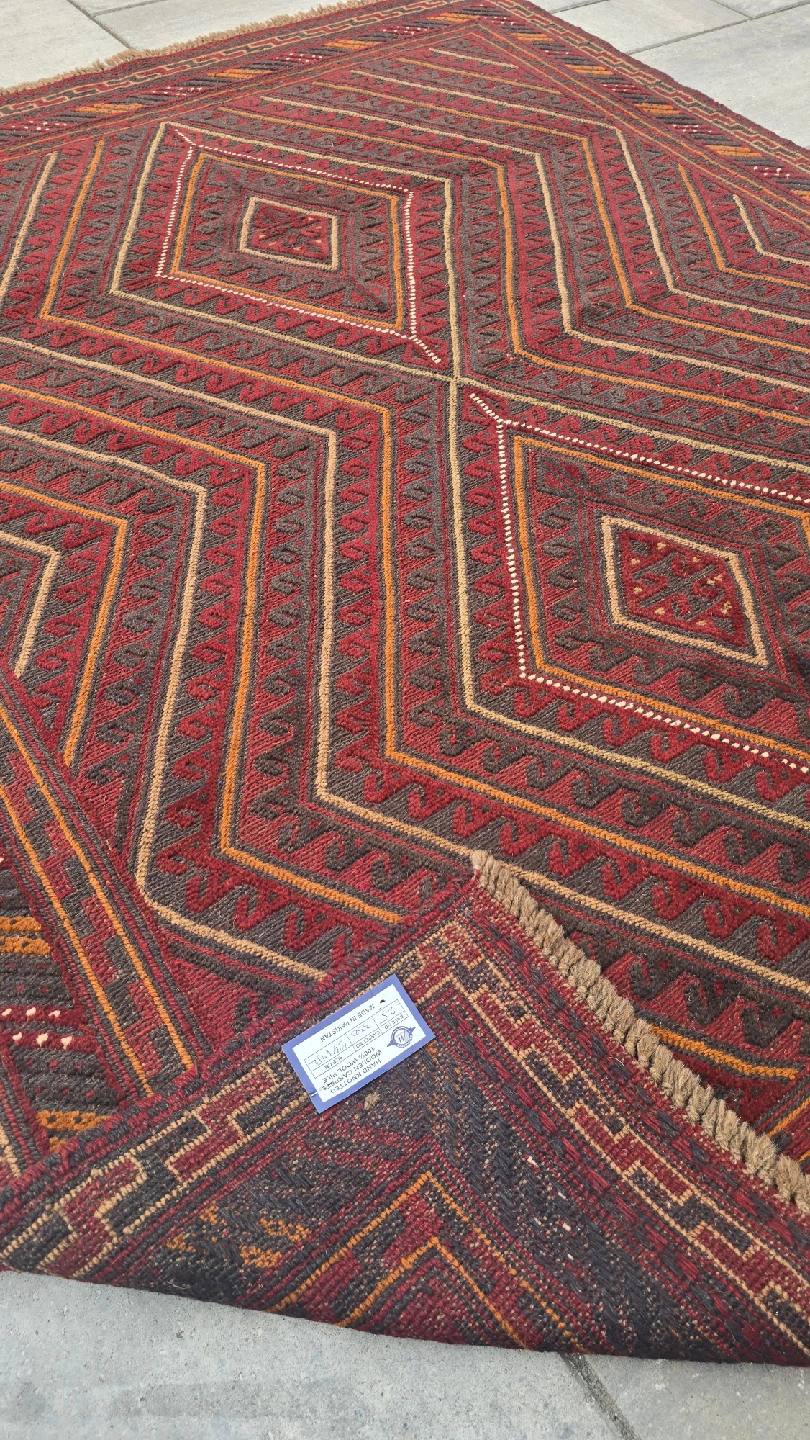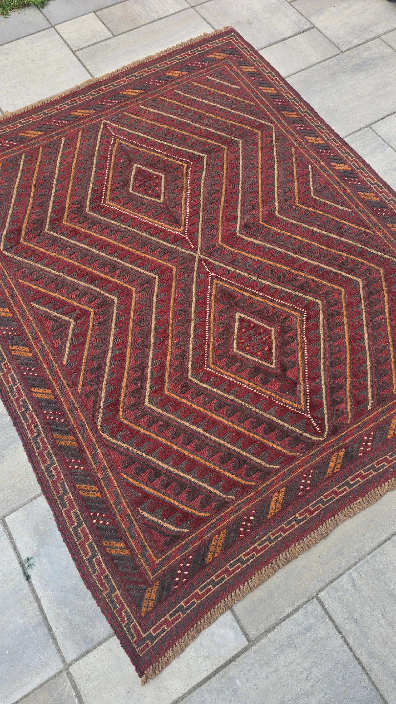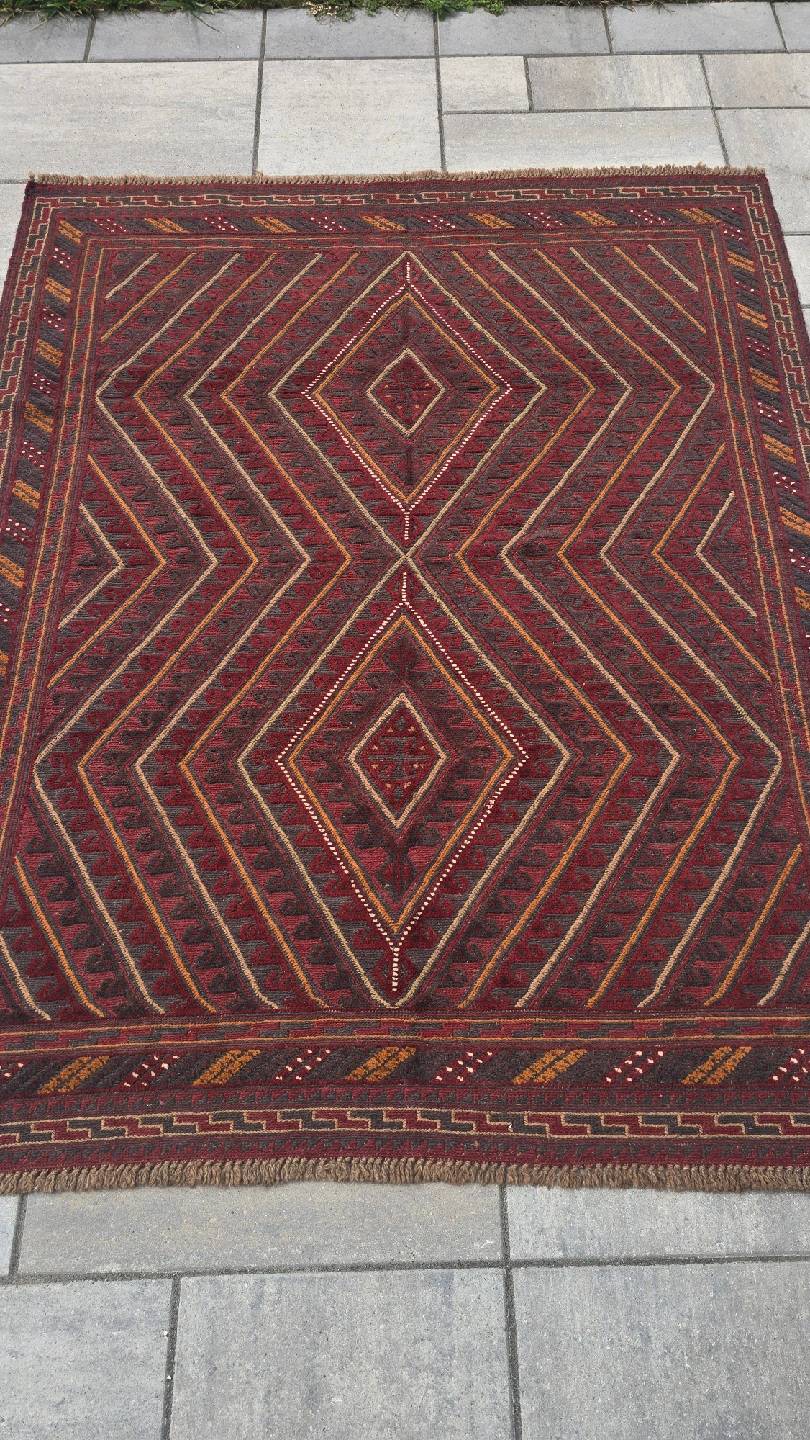 This is a lovely area rug with a geometric diamond pattern in shades of red, brown, and tan. It would look great in any room of the house! The rug is in good condition.