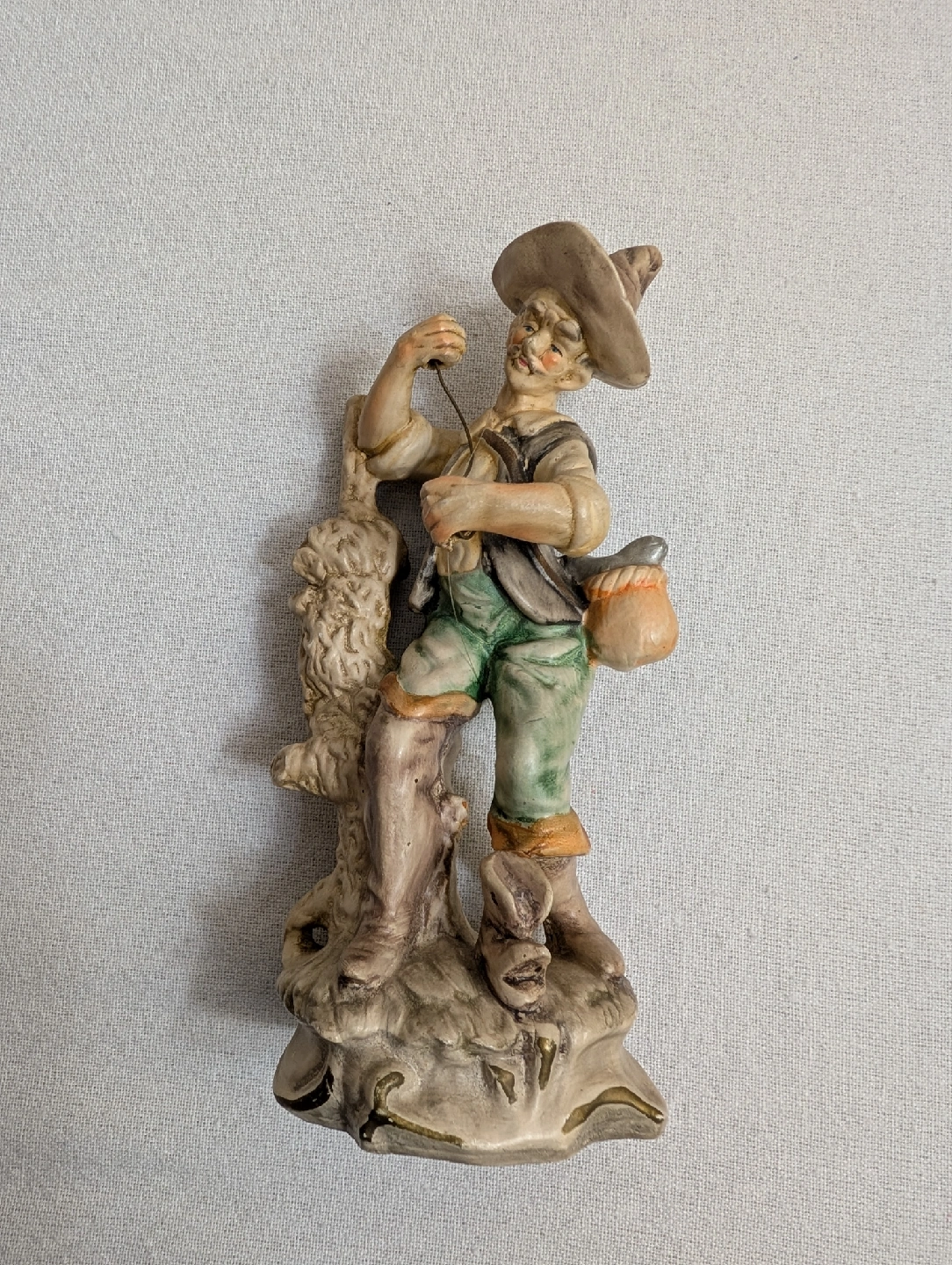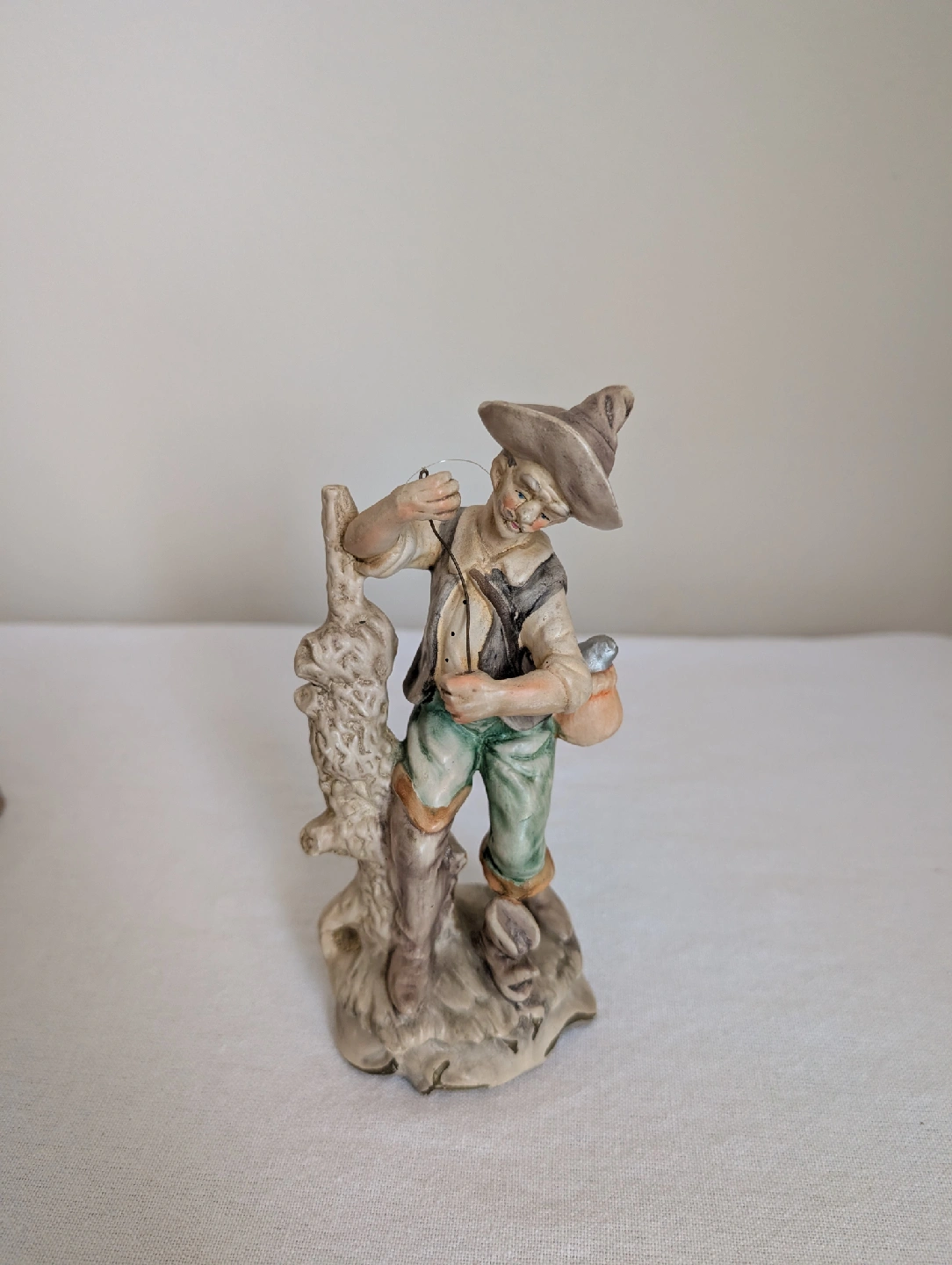 This is a lovely hand-painted figurine from Portugal. It depicts a man with a hat, standing next to a tree. It would make a nice addition to any collection! 📍Keele and Rogers home decor, knickknacks, curio, doodads, novelty, decoration, bookshelf decor