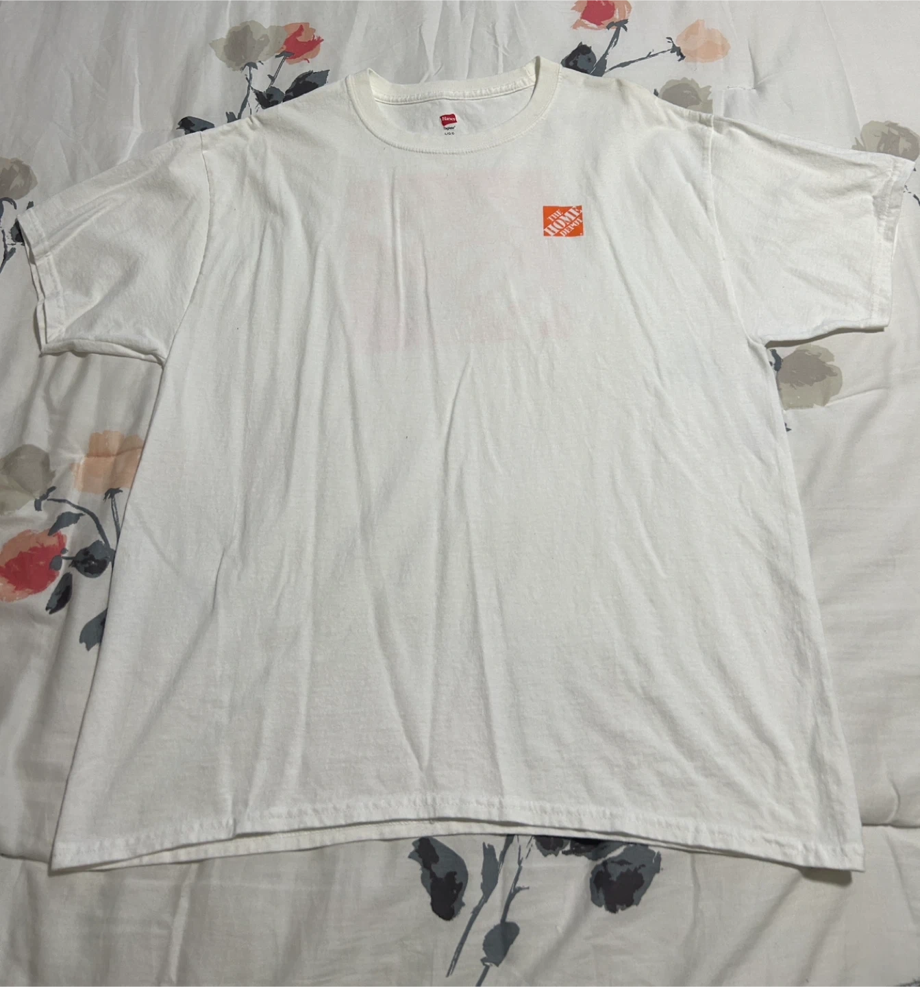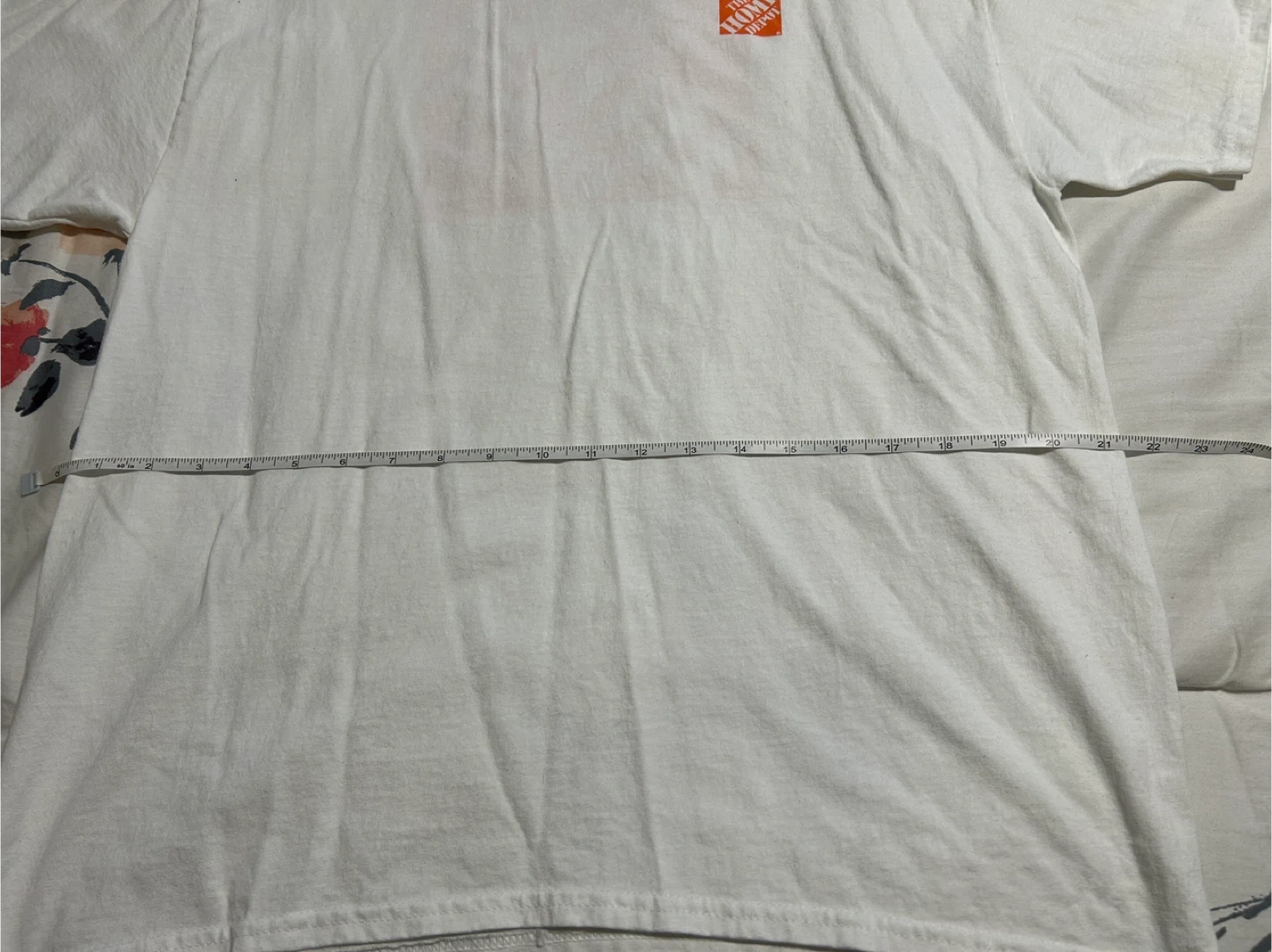 Here's a Hanes t-shirt in size large with the Home Depot logo. It's white and made of 100% preshrunk cotton. Perfect for casual wear or showing your love for your favourite hardware store! Never worn, would make a great shirt to wear for painting, household repairs, yard work etc. Center is 21.5” across Length is 28” Smoke Free/Pet Free home Check my other listings for more clothing items!