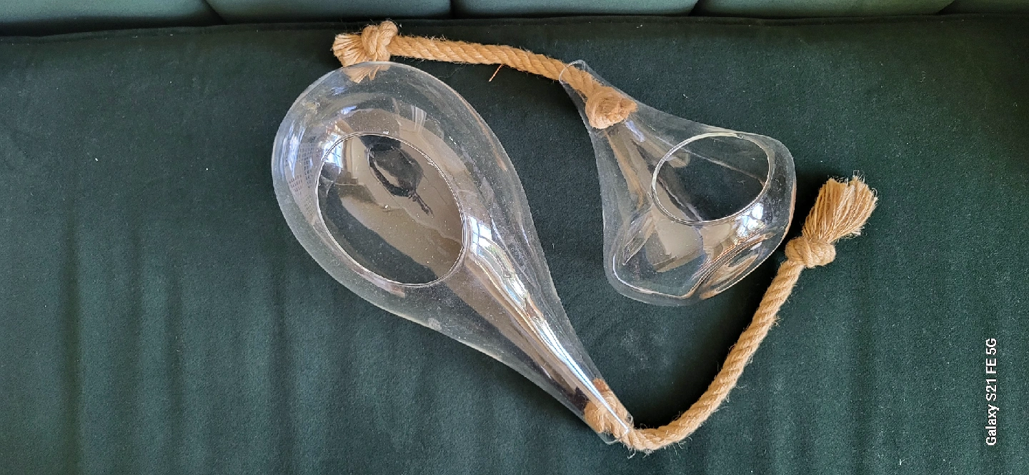Two clear glass hanging planters with rope accents 8 inches and 13 inches