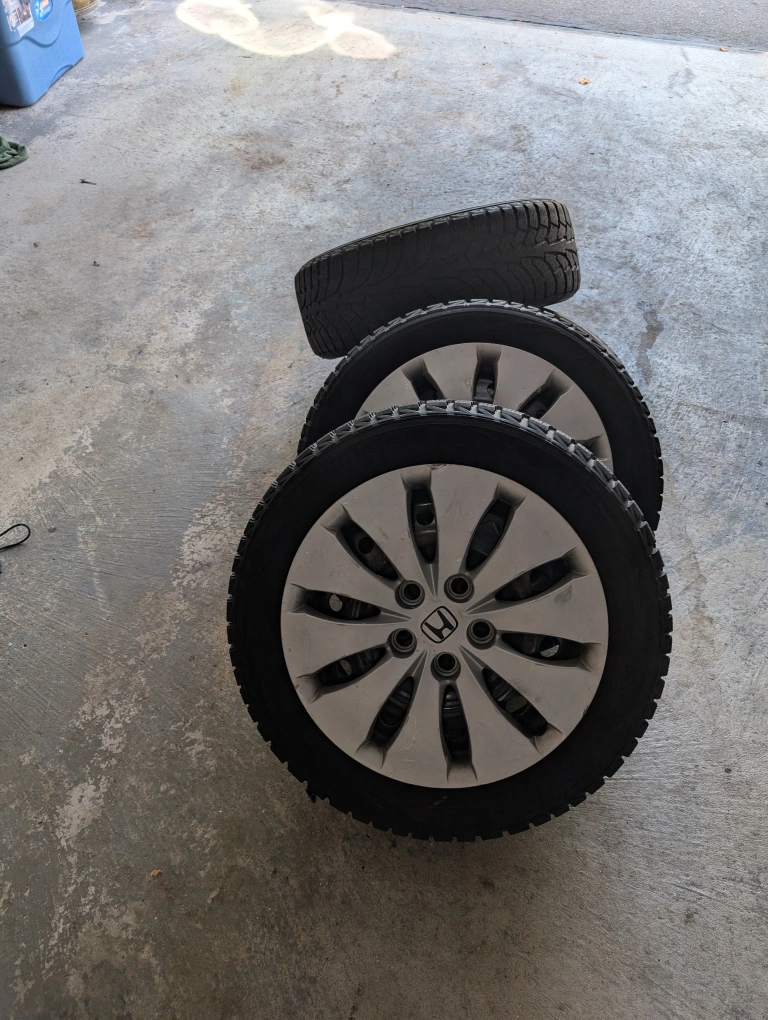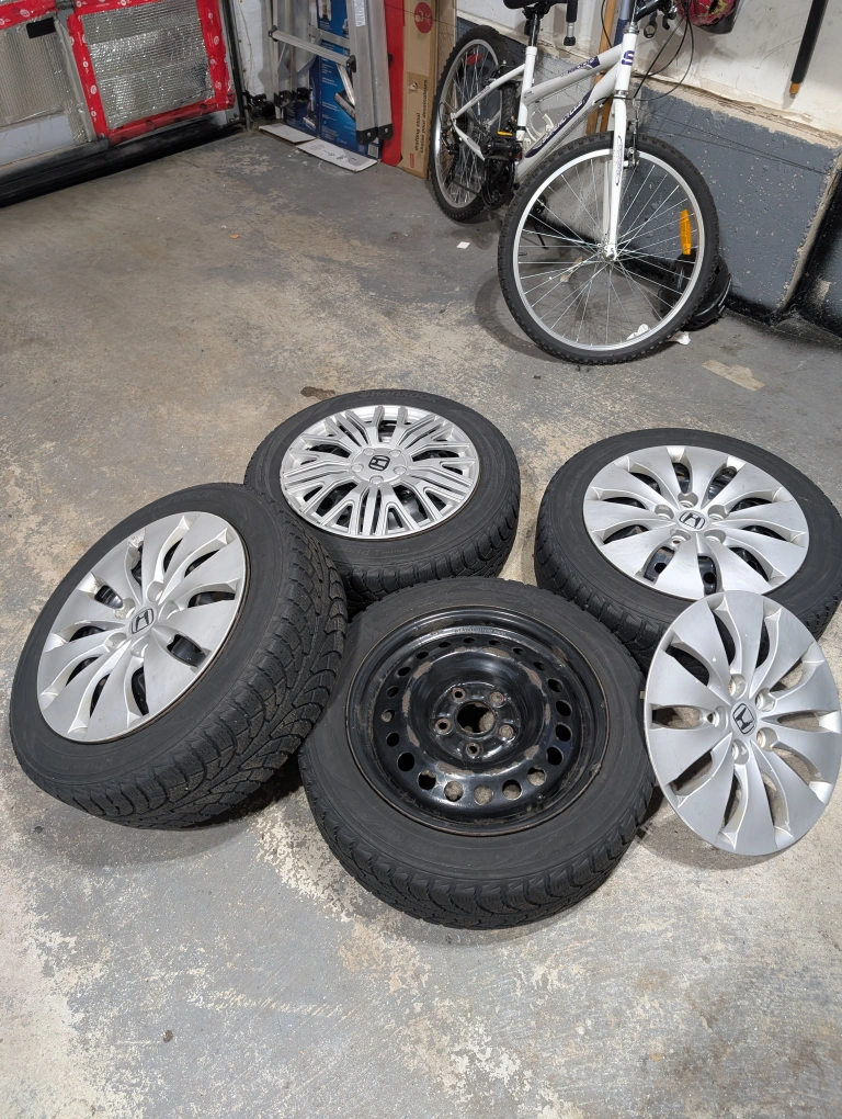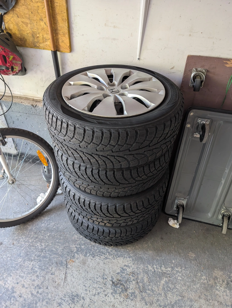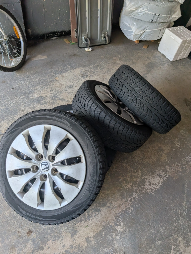 Selling a set of four Hankook Winter i*Pike RSV winter tires, size 205/55R16, mounted on steel rims with Honda wheel covers.These tires are great for winter driving and have plenty of tread left!