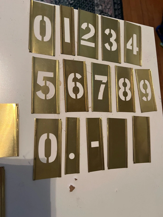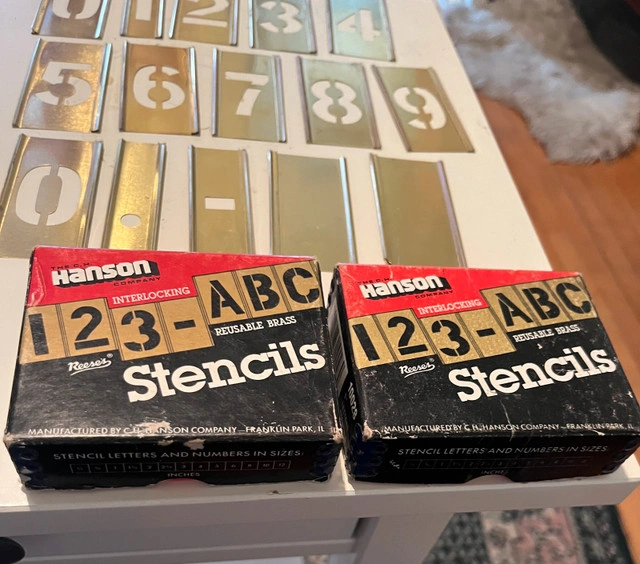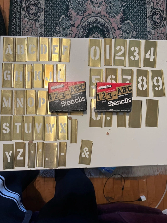 Selling a set of Hanson Interlocking stencils. These are reusable brass stencils for letters and numbers. Perfect for various projects!