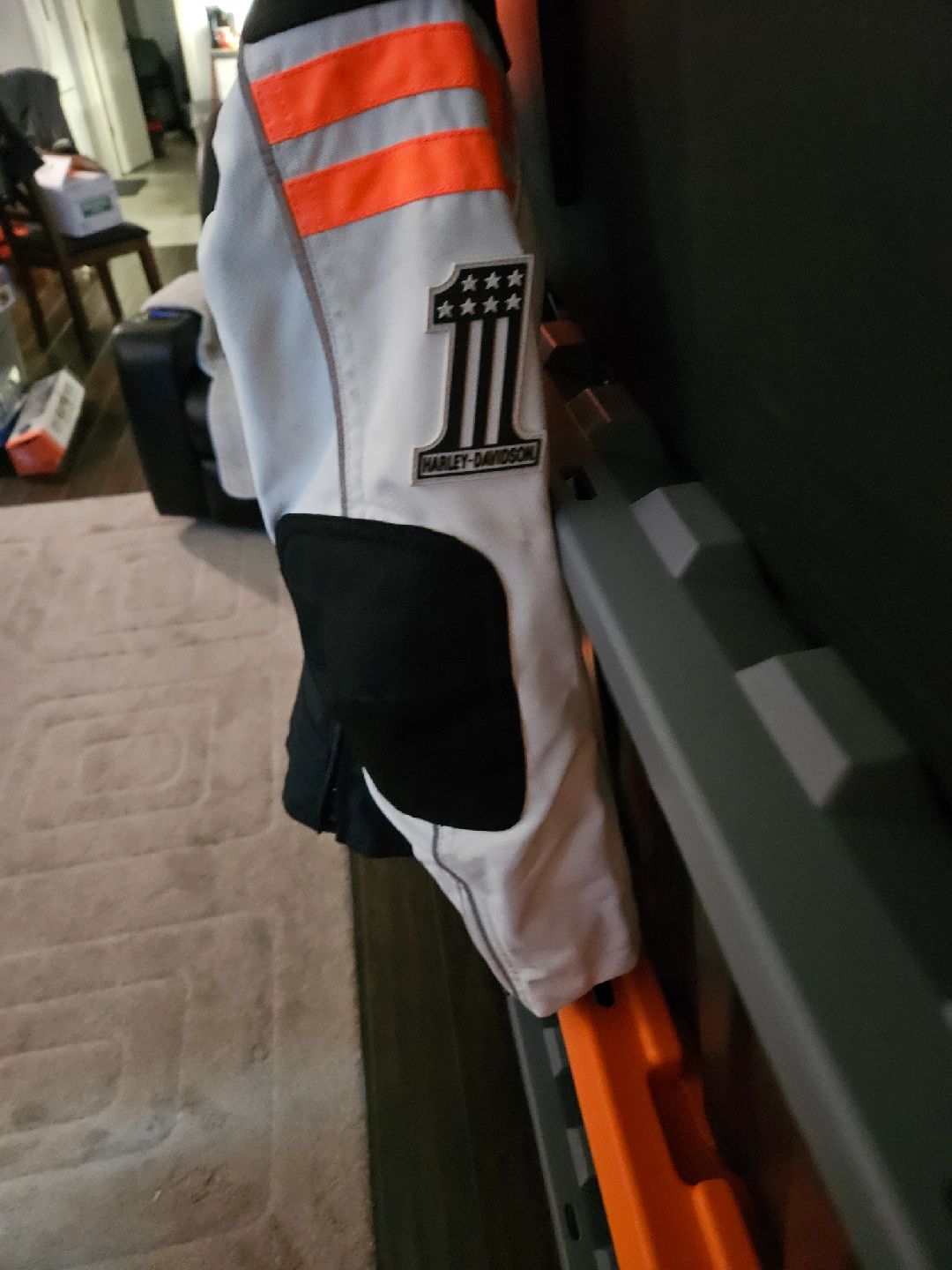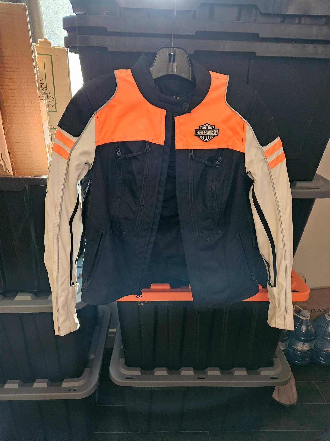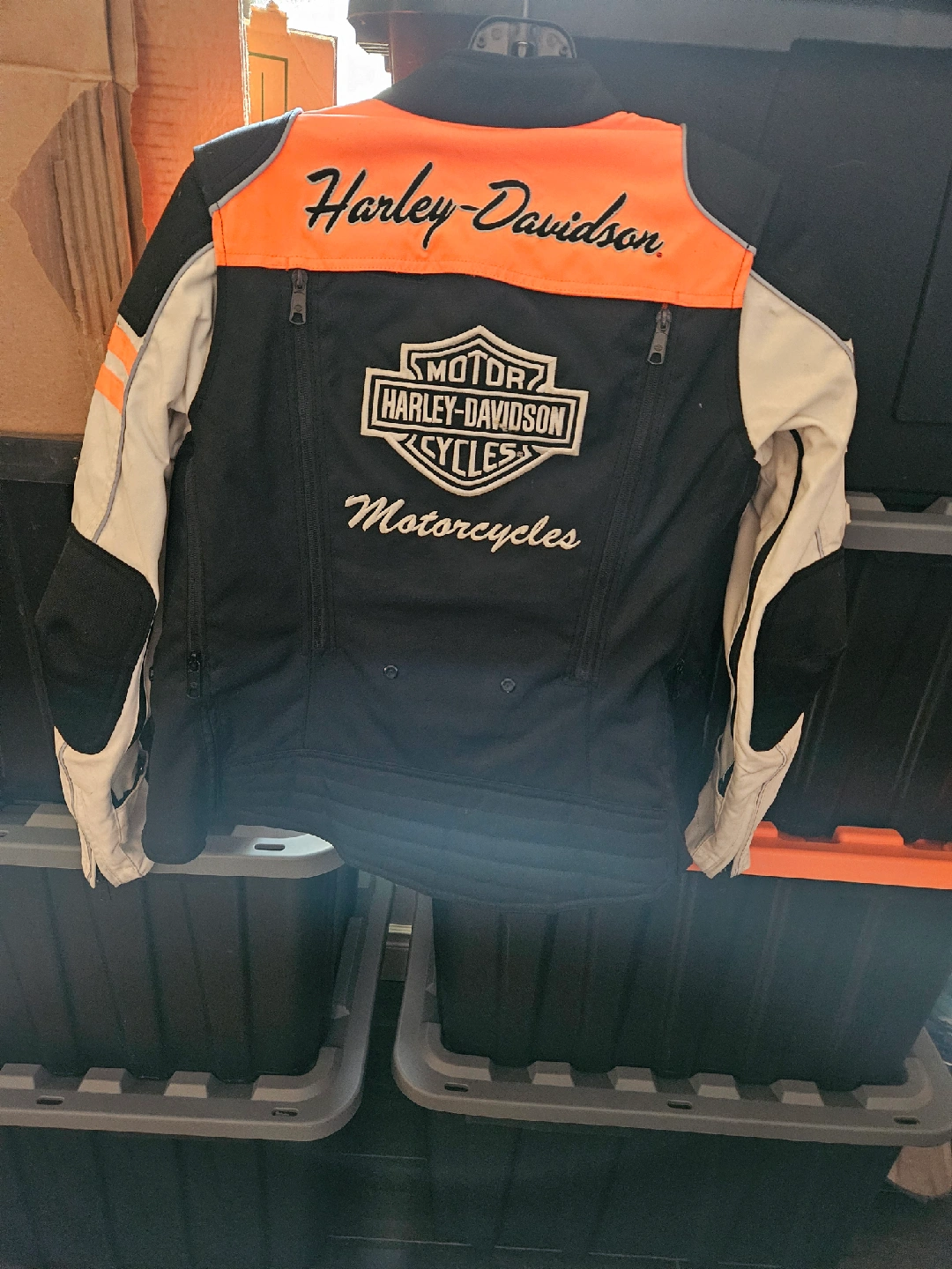 Harley-Davidson motorcycle jacket in black, orange, and white. Features the Harley-Davidson logo on the front and back. Perfect for any Harley enthusiast!