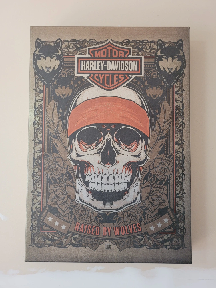 Cool Harley-Davidson art piece featuring a skull and wolf design! It's titled 'Raised by Wolves' and would look great in any garage or den