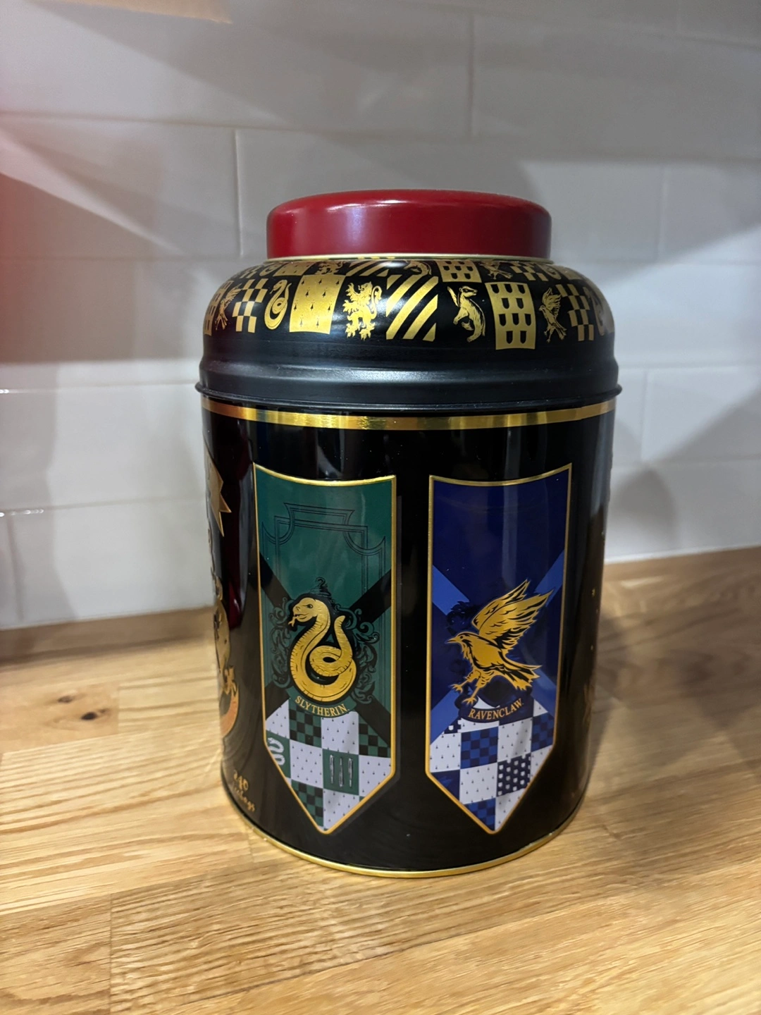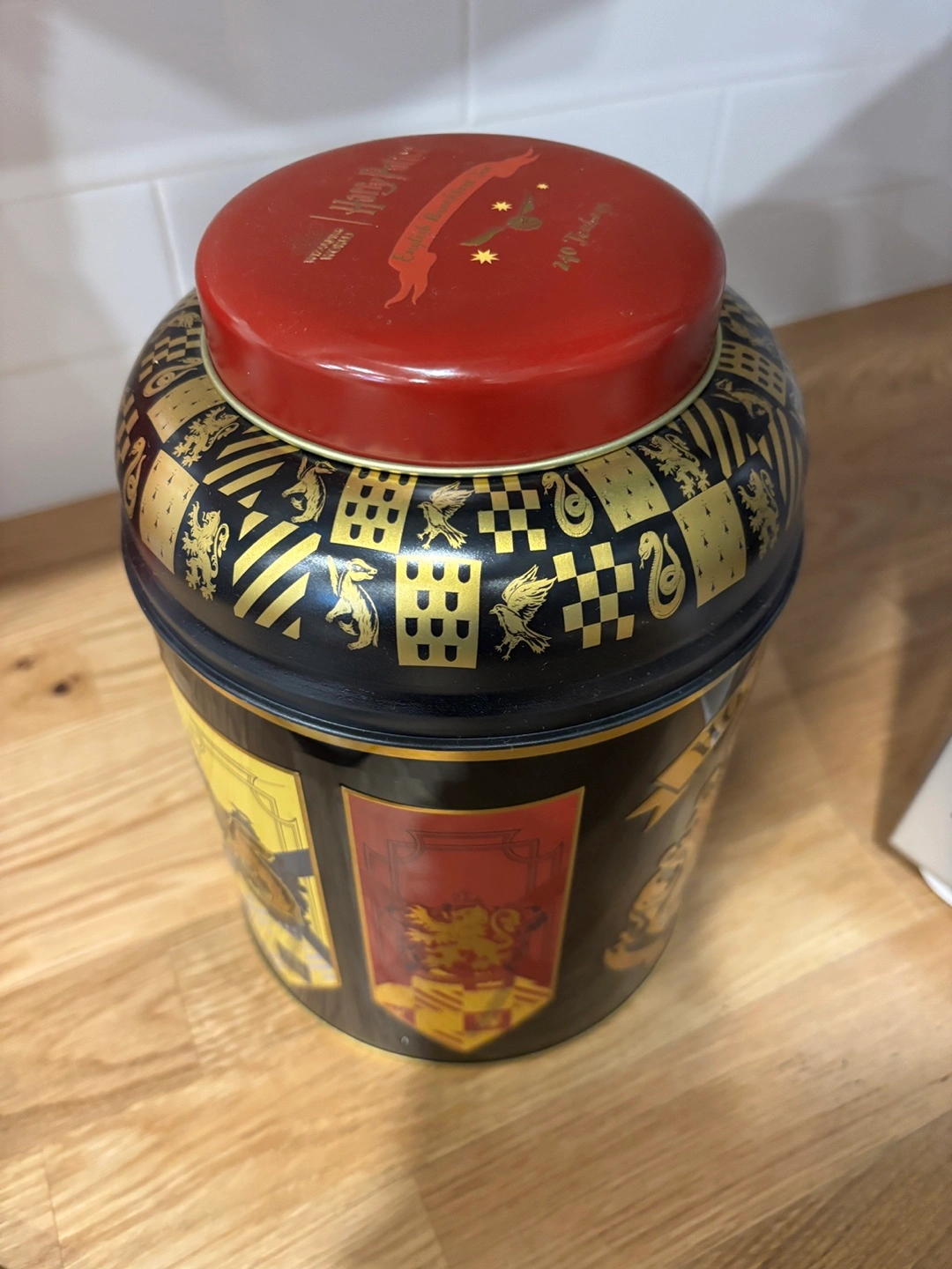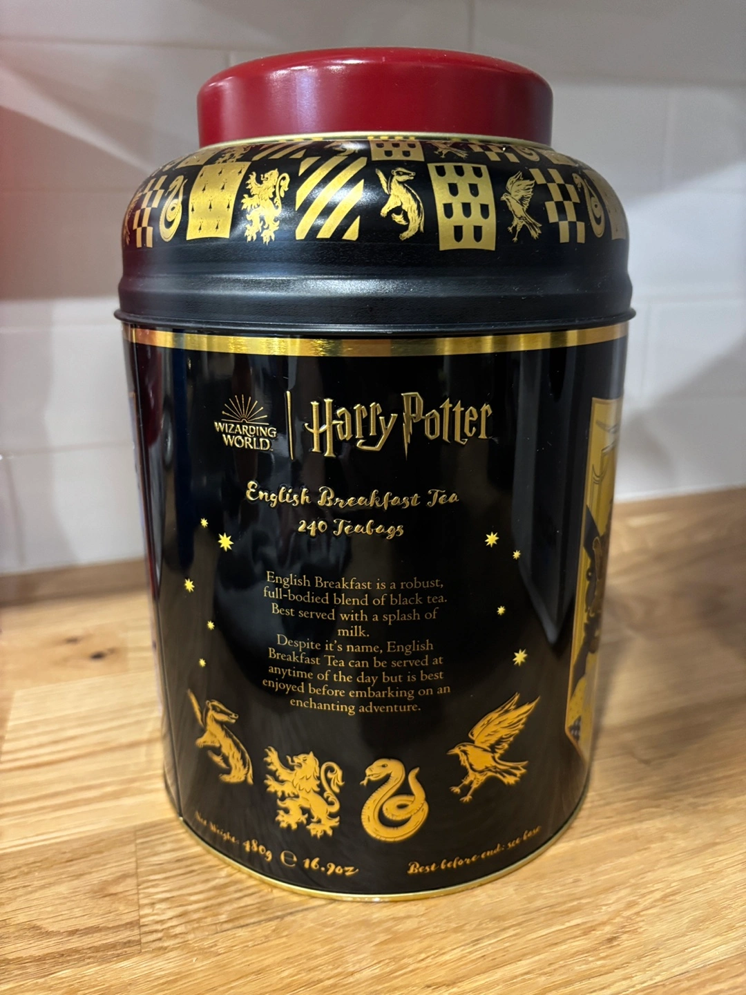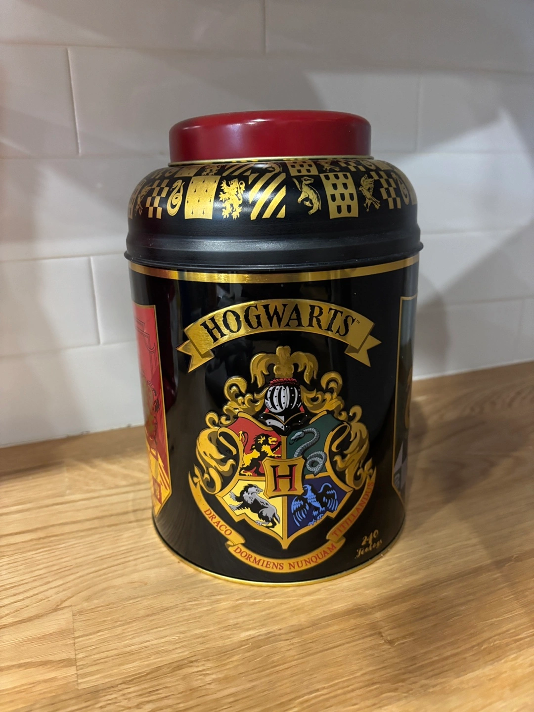 Selling a Harry Potter English Breakfast Tea tin! It features the Hogwarts crest and the emblems of all four houses. It once contained 240 teabags of English Breakfast tea, a robust blend of black tea.