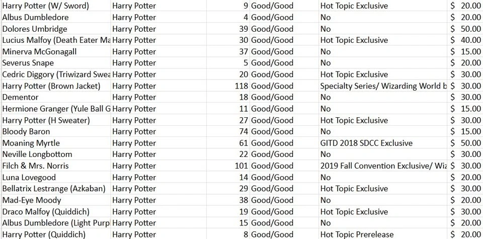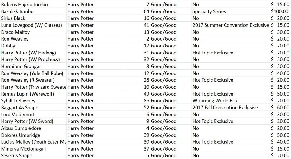 Selling my Harry Potter Funko Pop Collection. Prices can found in the photos. Pickup only. Hillcrest mall preferred. SOLD: Bellatrix Lestrange Harry #41 Harry #8 Luna with Glasses Moaning Myrtle Filtch and Ms. Norris Dobby Sybill Newt