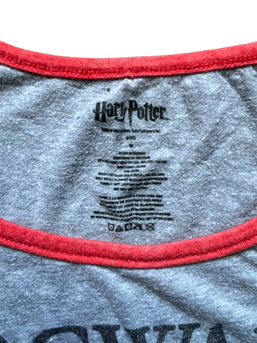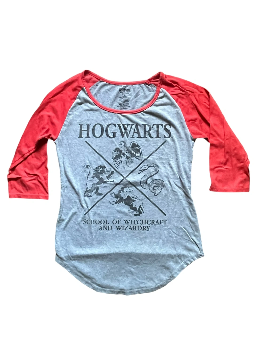 Brand: Harry Potter (Warner Bros. Entertainment Inc. Official Merchandise) Description: This Harry Potter Hogwarts Raglan T-Shirt is a must-have for fans of the Wizarding World. Featuring a heather gray body with bold red 3/4 length raglan sleeves, the shirt displays the word Hogwarts across the chest along with the iconic animal symbols representing the four Hogwarts houses: Gryffindor lion, Slytherin serpent, Ravenclaw eagle, and Hufflepuff badger. Beneath the design, the phrase School of Witchcraft and Wizardry is printed, paying homage to the magical academy. Crafted with soft, breathable fabric, this officially licensed shirt provides casual comfort while letting you show off your fandom. Its rounded hem and relaxed fit make it great for everyday wear or themed events. Size: Medium Condition: Pre-owned, in excellent condition. No visible flaws, rips, or damage. Ready for the next fan to enjoy. Business Name: TSM Department Store Retail Price: $3.00