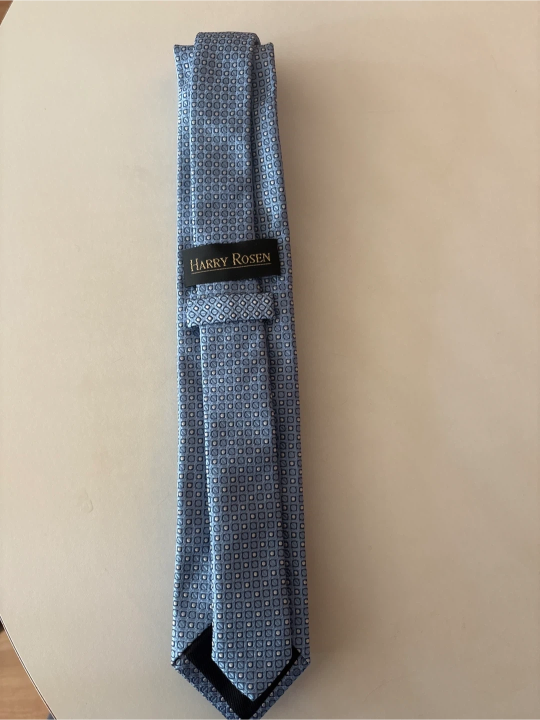 Selling a stylish Harry Rosen necktie. It features a nice blue patterned design that would look great for any occasion!
