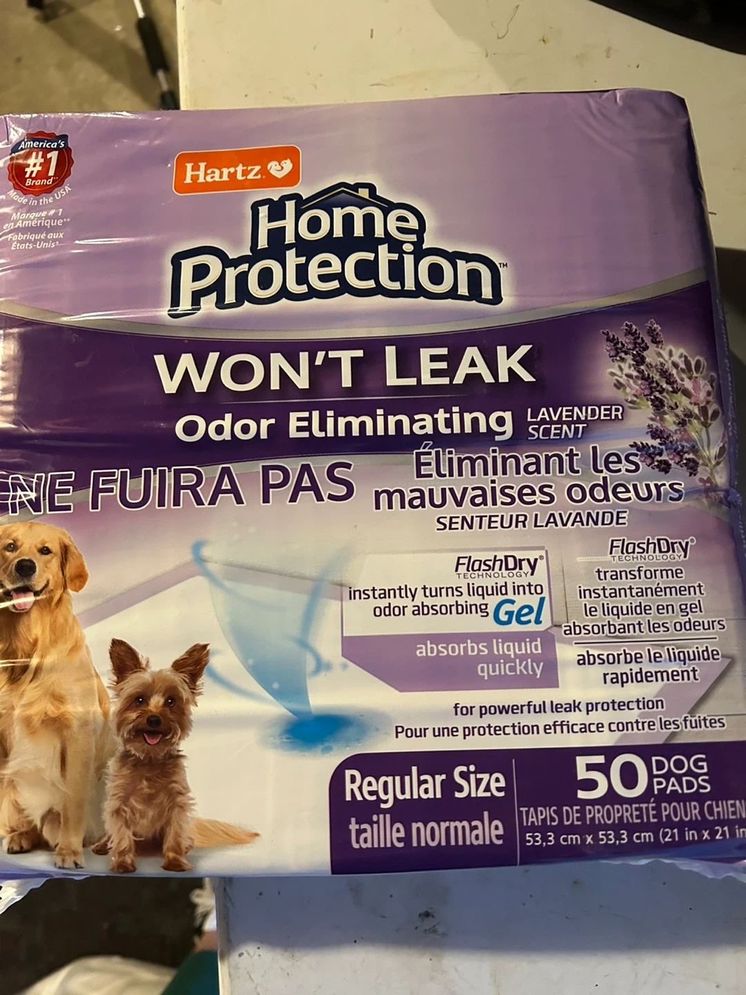 Selling a pack of Hartz Home Protection dog pads in the regular size. This package contains 50 pads. They're designed to eliminate odours with a lavender scent and feature FlashDry technology to quickly absorb liquid. Perfect for puppy training or for older dogs!
