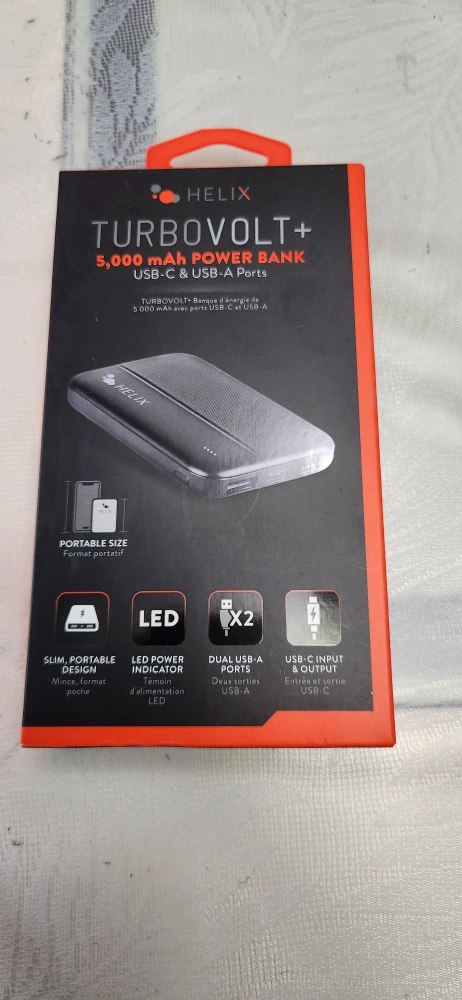 Selling a brand new Helix TurboVolt+ 5,000 mAh power bank. It's still in the box! Key features include: - Charges up to three devices at once - Built-in over-current and short circuit protection system - USB-C & USB-A ports - Slim, portable design - LED power indicator - Dual USB-A ports - USB-C input & output. Pick up in Orleans.