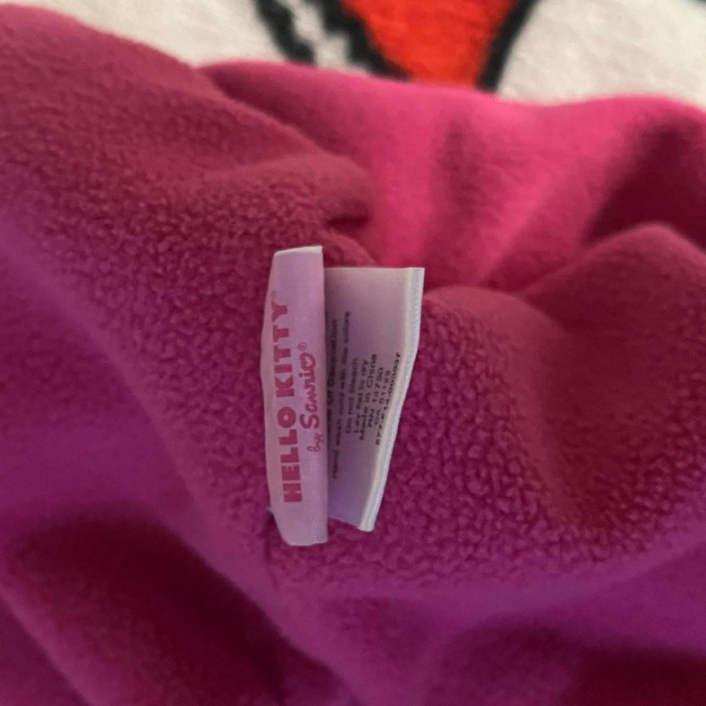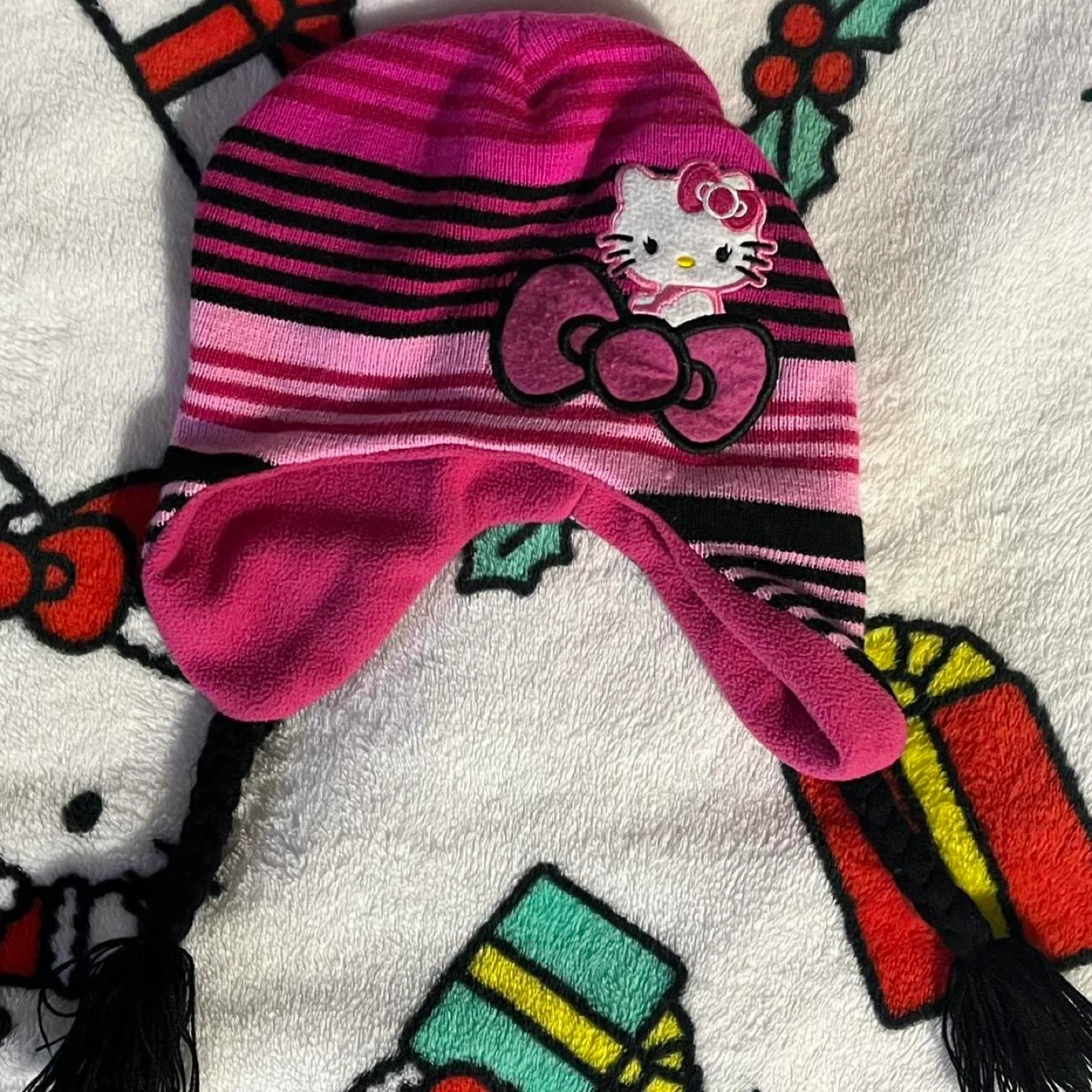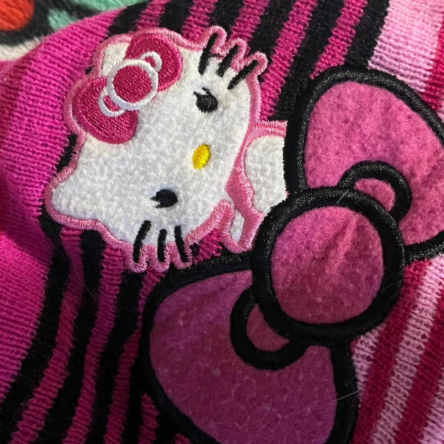 Super cute Hello Kitty by Sanrio beanie! It features a pink and black striped design with a Hello Kitty patch. Perfect for keeping warm and adding a touch of kawaii to your outfit! Do not wash with like colors, and hang or flat to dry