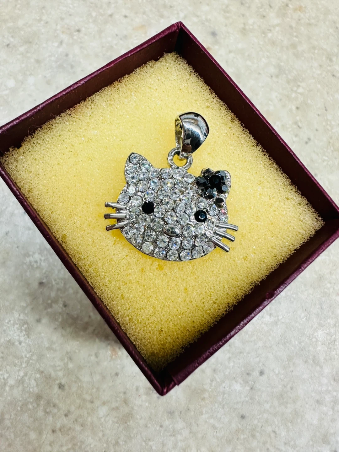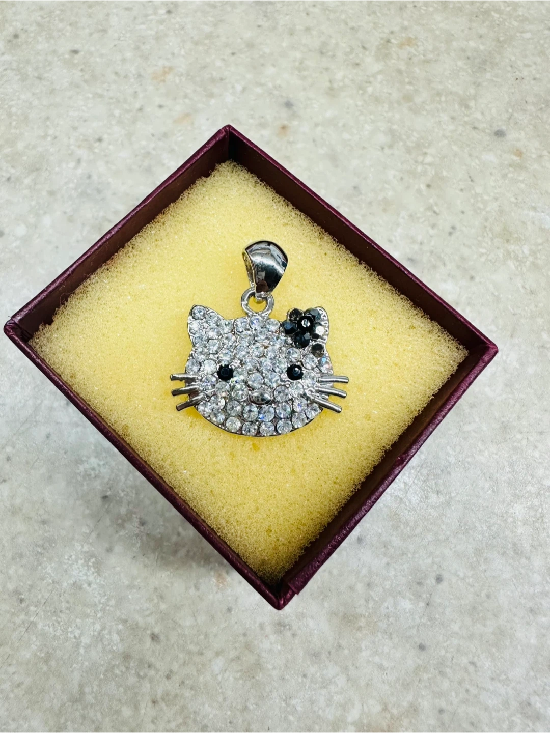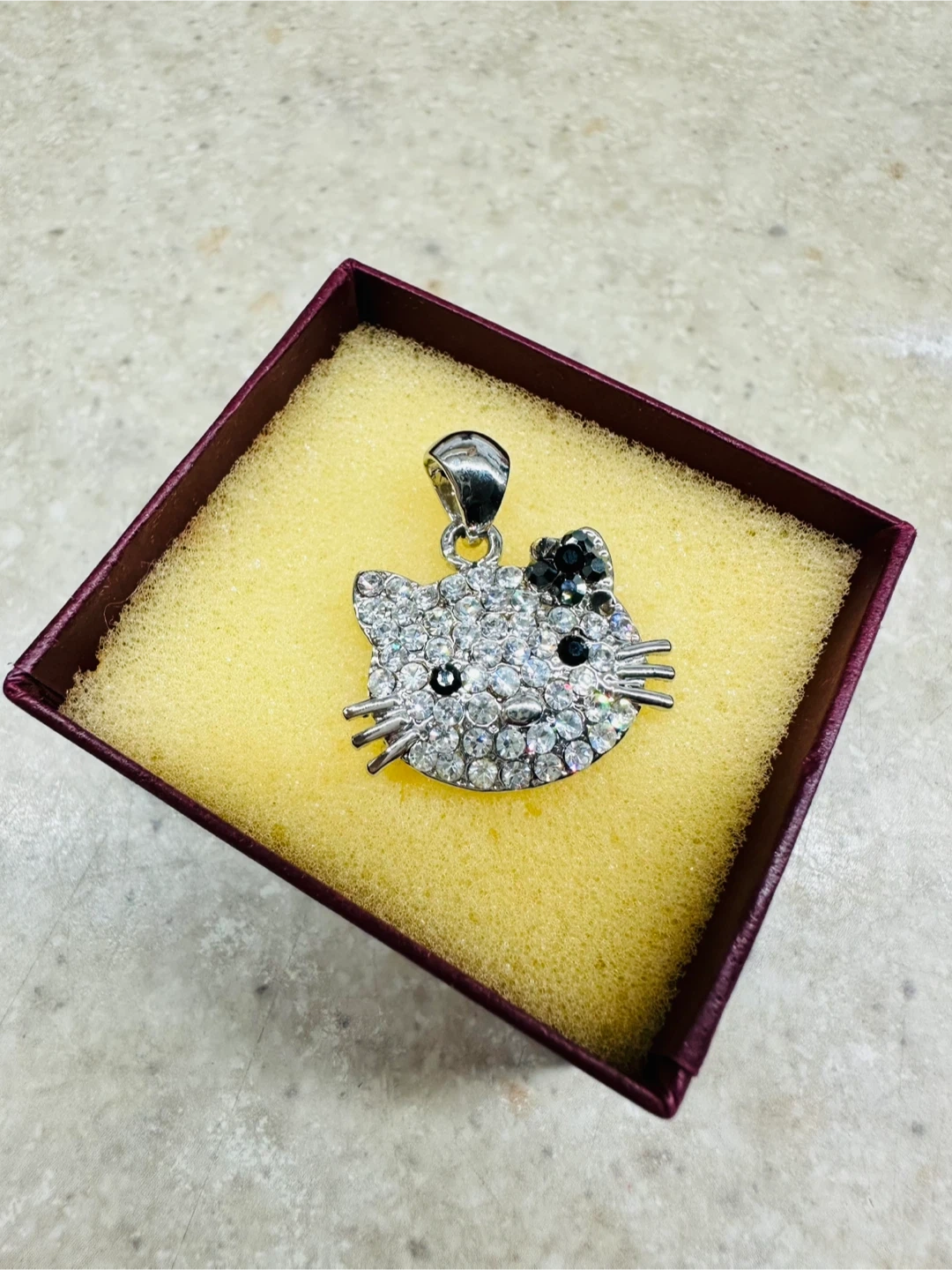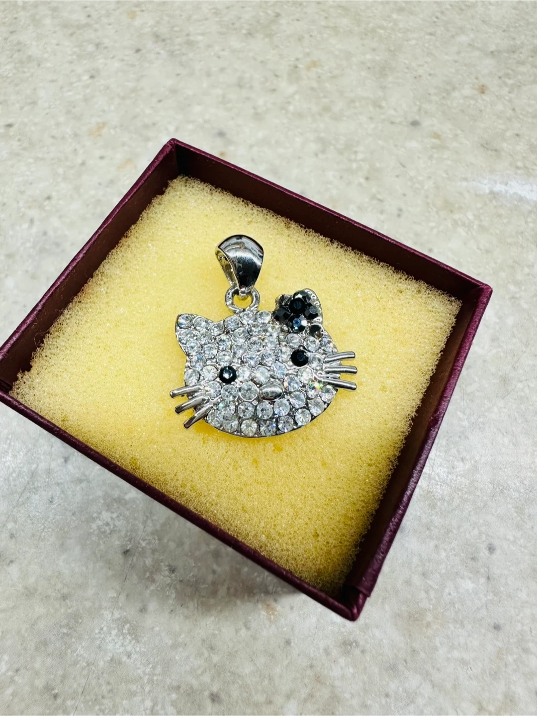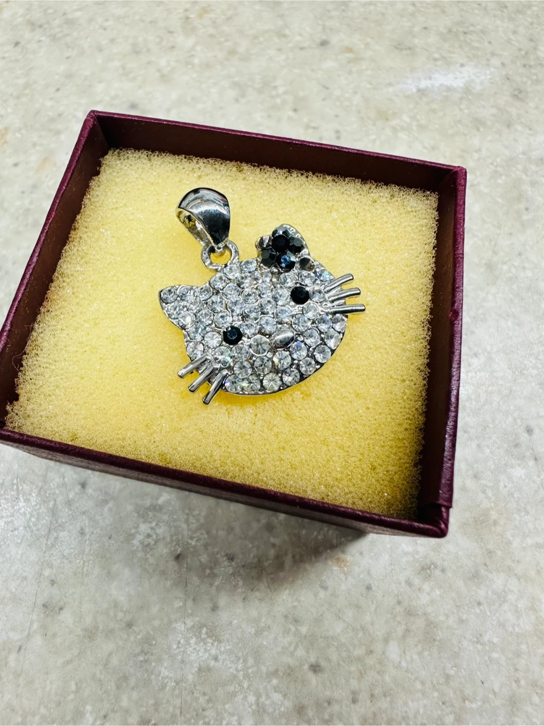 Super cute Hello Kitty pendant! It's silver and covered in sparkly rhinestones. Comes in a box, perfect for gifting or keeping it safe