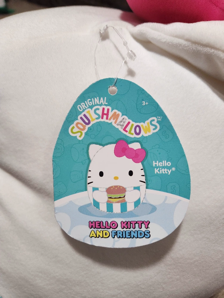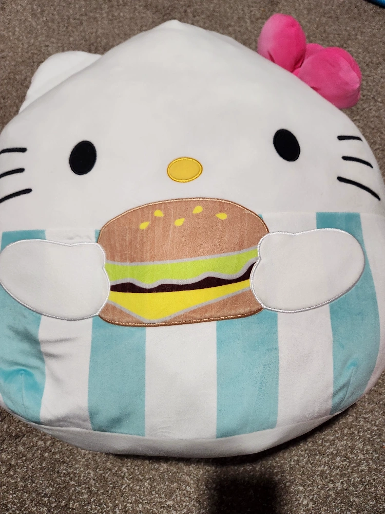 Large 20" Hello Kitty plush toy. Features Hello Kitty holding a burger. Teal and white striped design. Original Squishmallows tag attached. Collectible item.