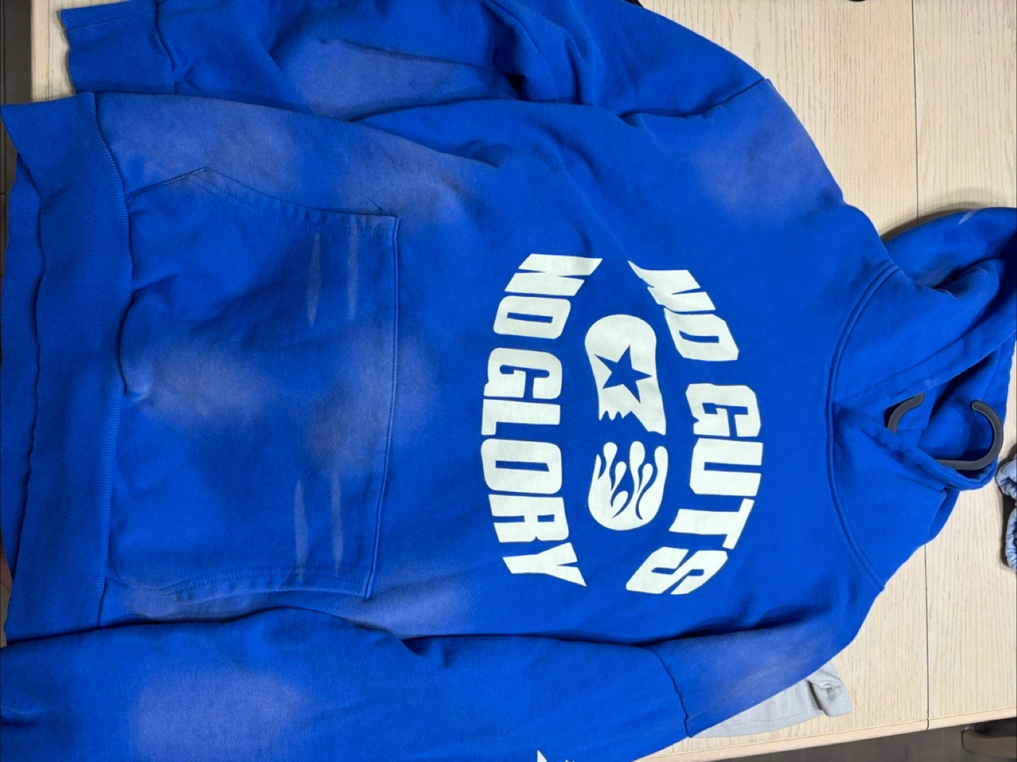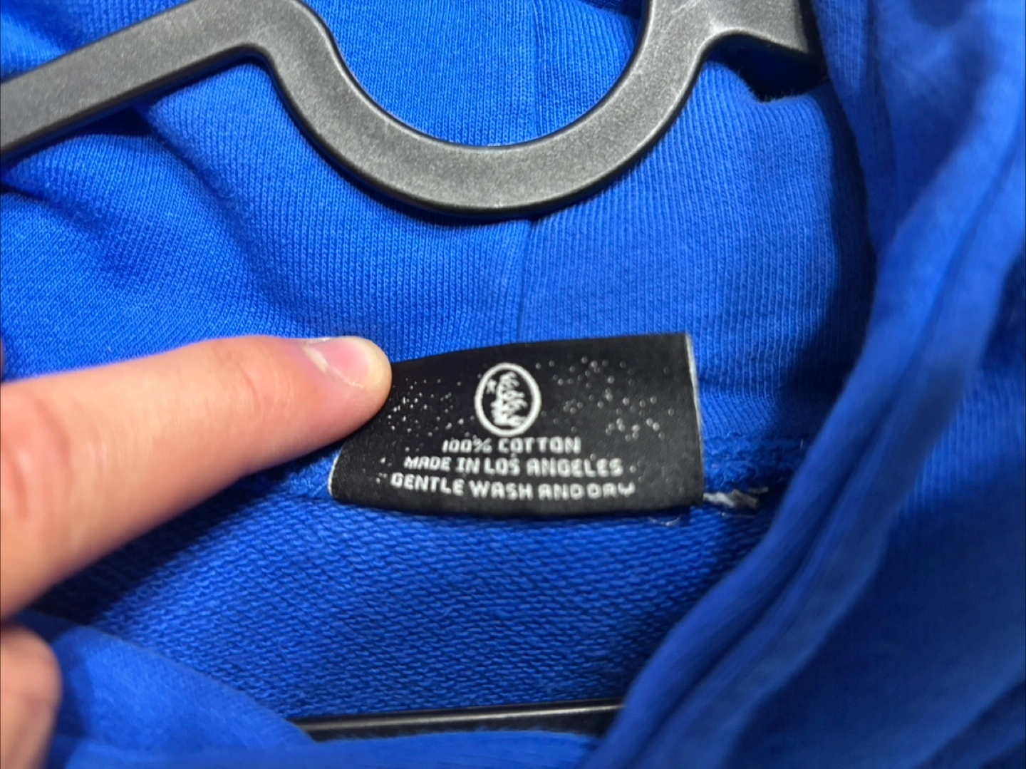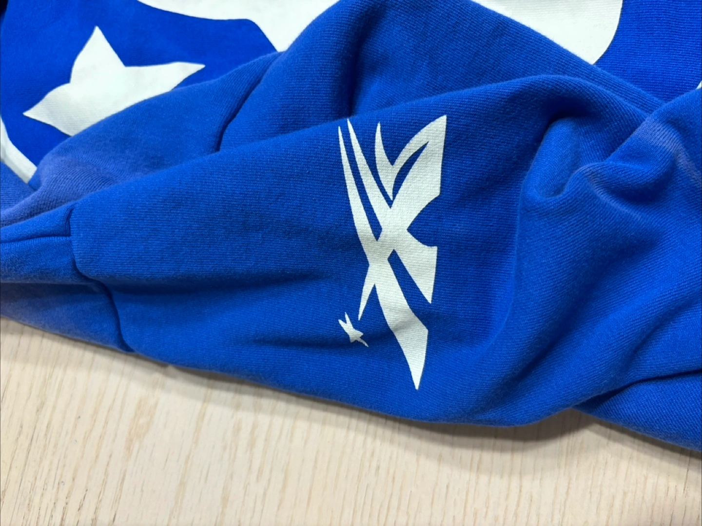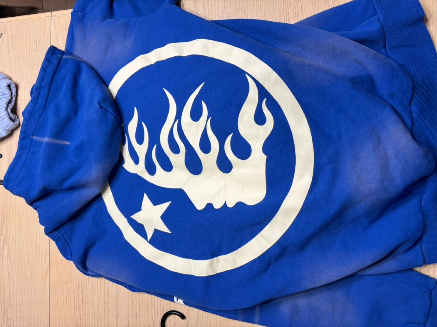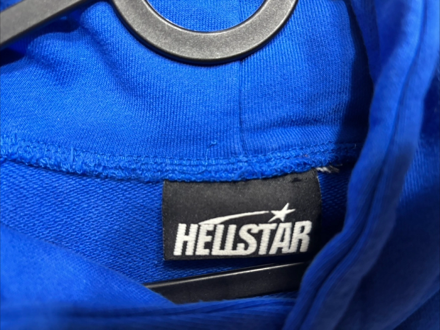 Selling a blue Hellstar hoodie! It's made of 100% cotton and has a cool design on the back and sleeve. The hoodie is in good condition and is perfect for everyday wear