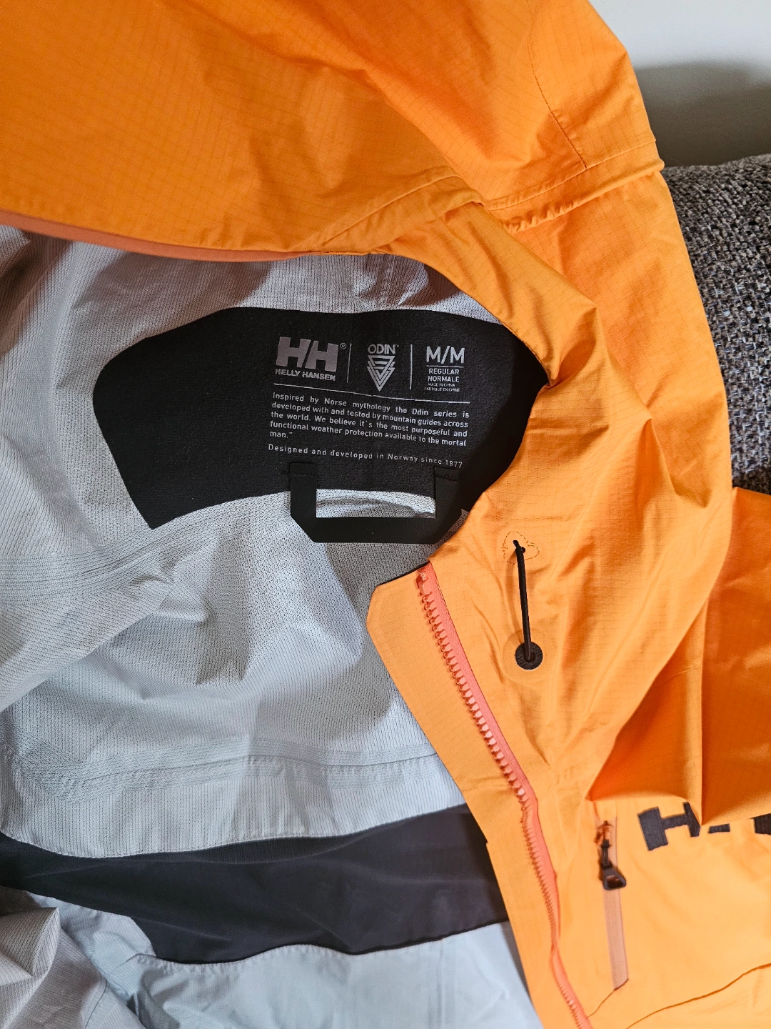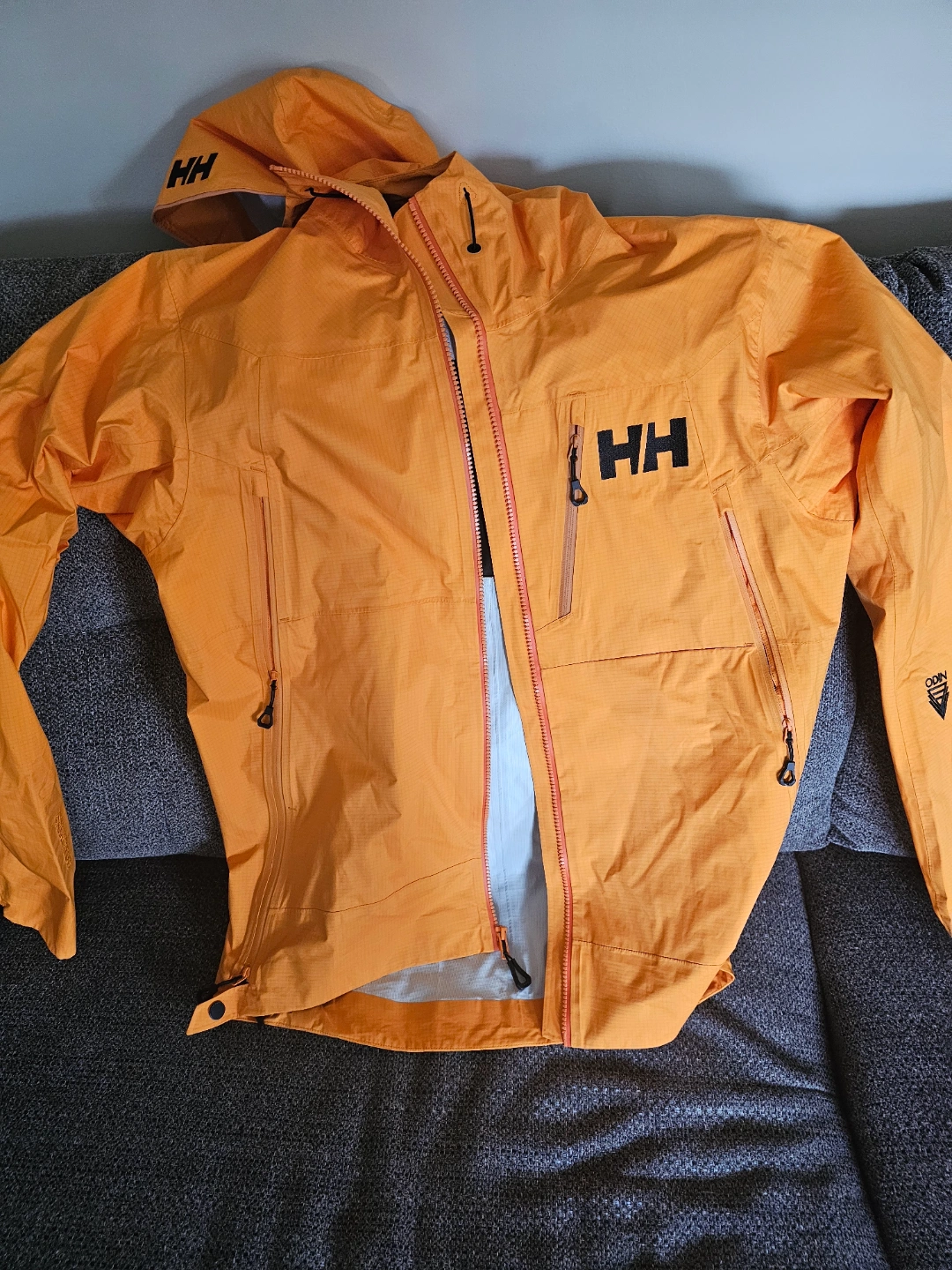 Men's Helly Hansen Odin series jacket. Size Medium. Orange colour. Waterproof and windproof. Features a hood and multiple pockets.