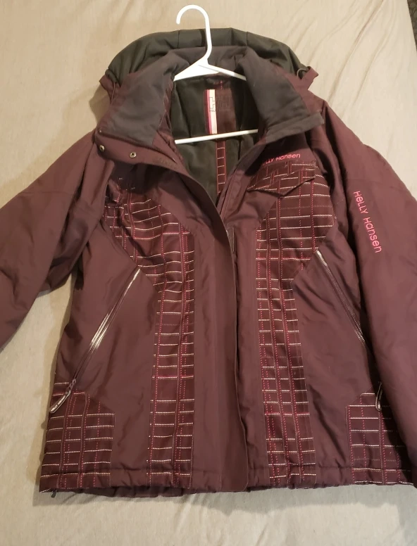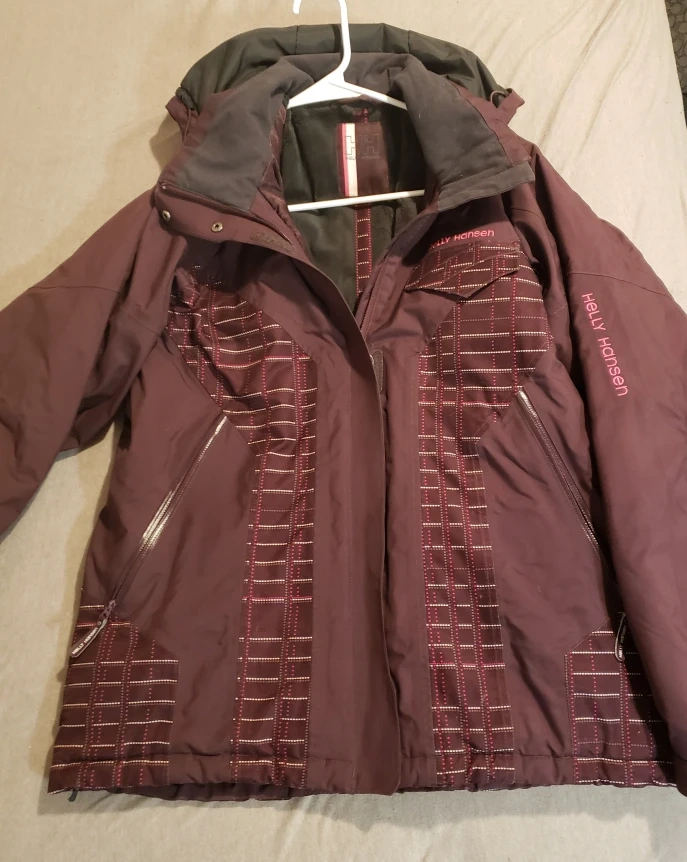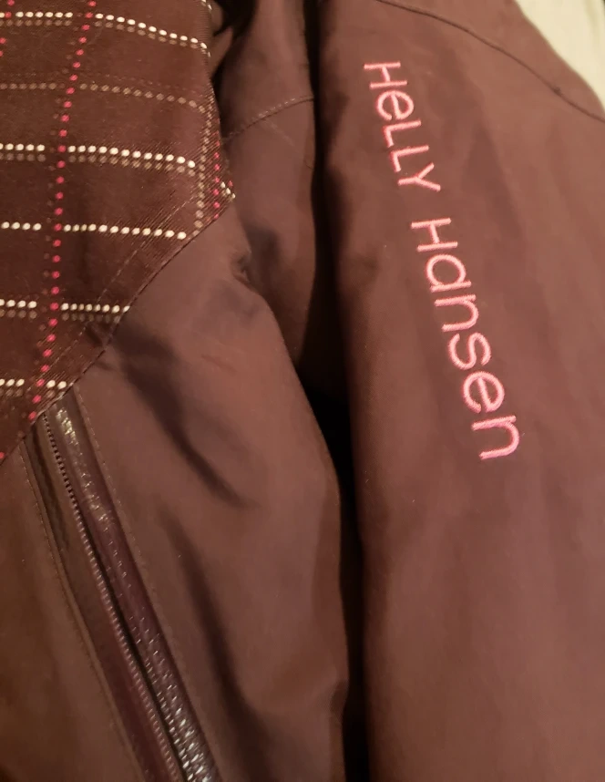 Selling a Helly Hansen women's jacket. It's a stylish and functional piece, perfect for staying warm and dry during outdoor activities. The jacket features a unique design with distinctive patterns and the Helly Hansen logo on the sleeve. It has a full zip front, a hood, and multiple pockets for added convenience.