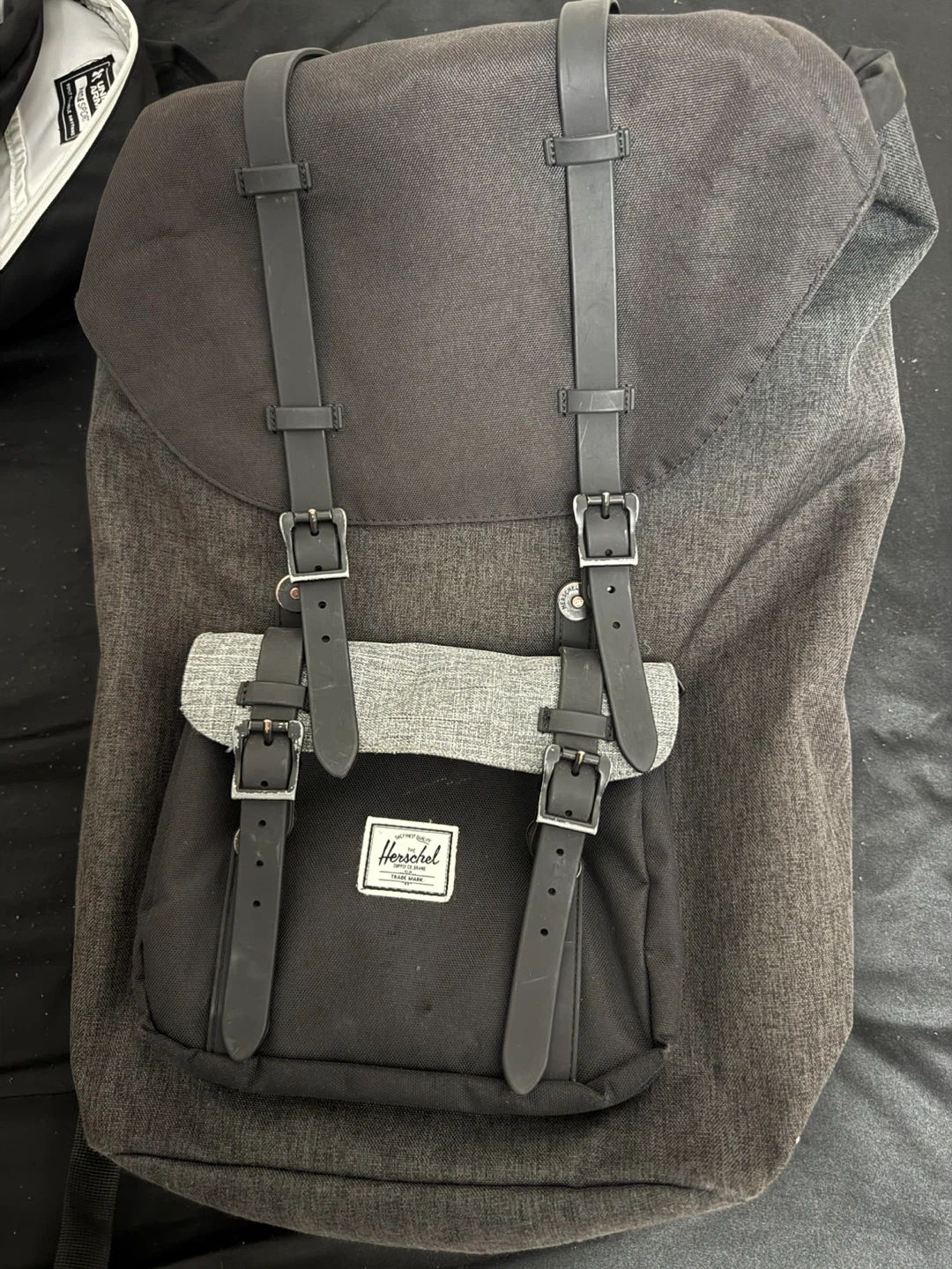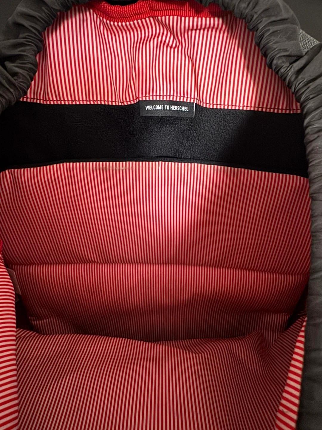 Selling a Herschel backpack in great condition! It's a stylish and durable backpack, perfect for school, work, or travel. The backpack features a grey and black exterior with the classic Herschel logo. The interior has a red and white striped pattern. It's a great bag for everyday use