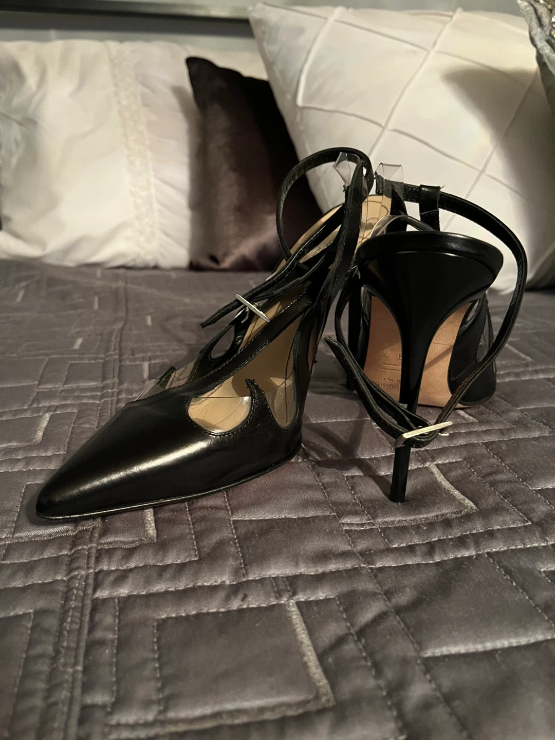 These Herzel de Bach heels bought in Rome at a boutique by the Spanish Steps , are a striking addition to any wardrobe! They feature a unique flame-like design on the sides and a sleek black finish. They are a size 9and are brand new never worn Wrap around the ankle strap super sexy!! One of a kind !