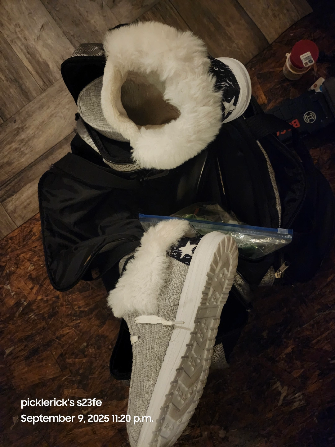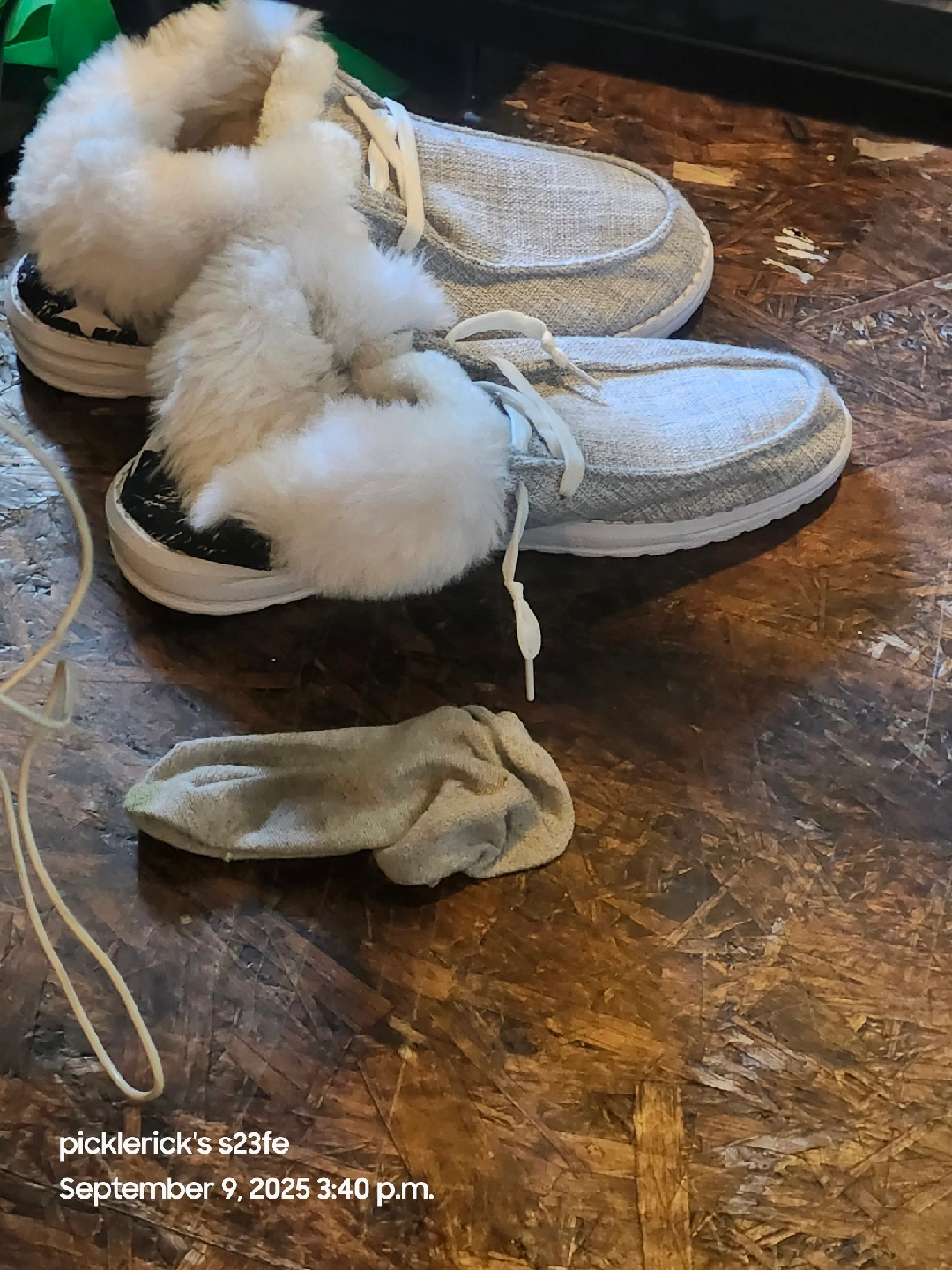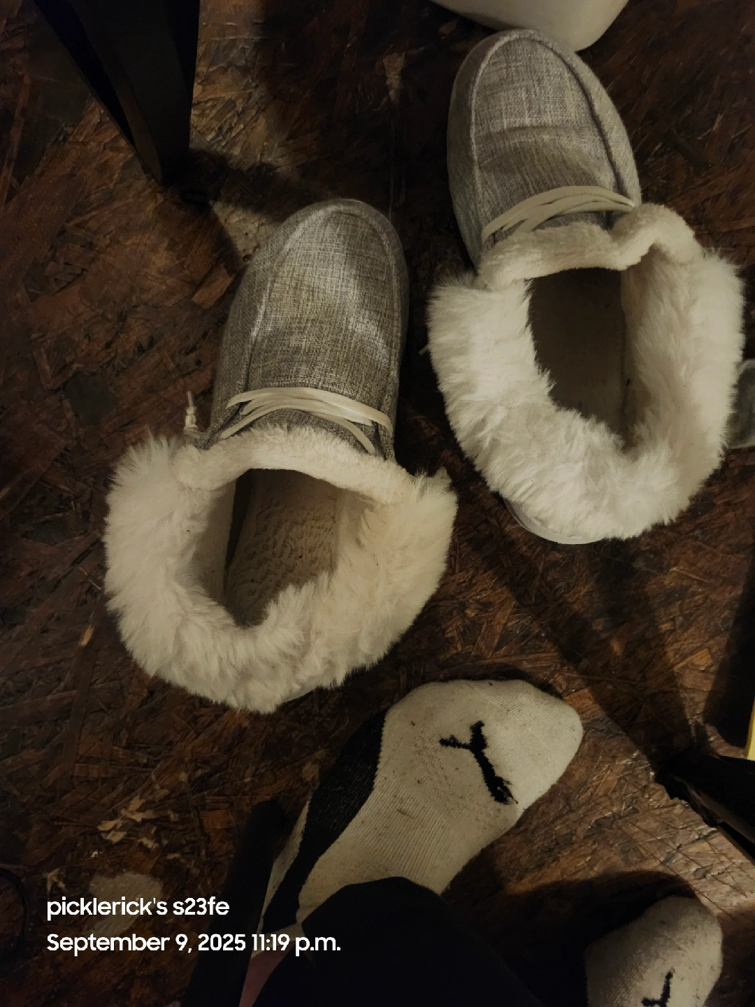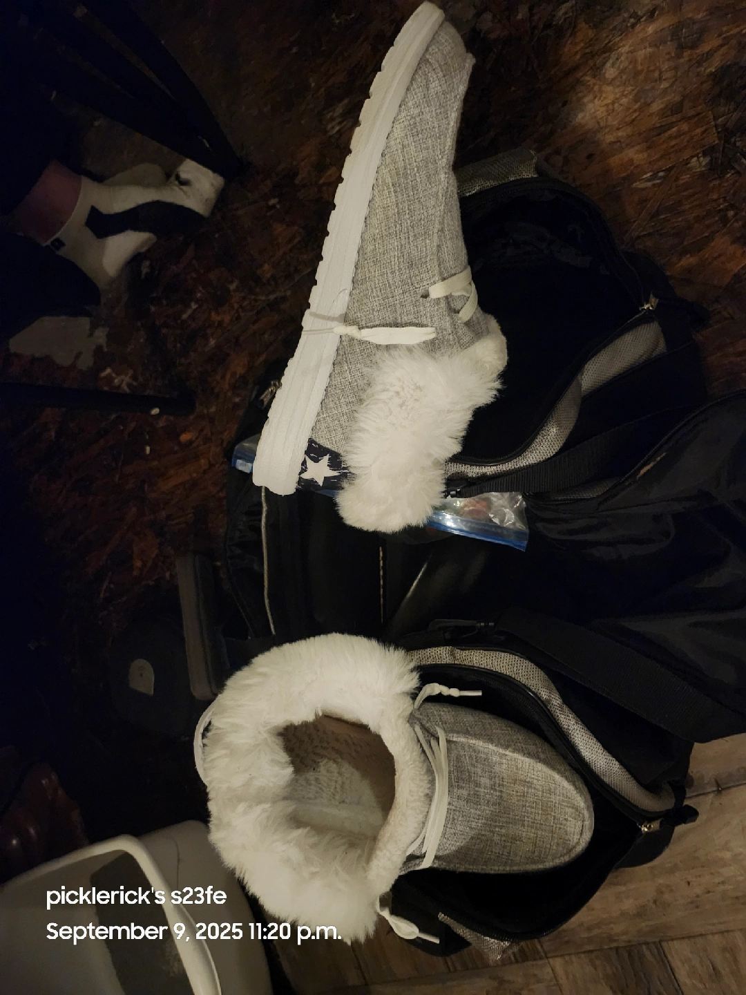 Cozy up with these Hey Dude women's slipper shoes! They're a size on the sole say 43 and feature a soft, furry lining to keep your feet warm and comfy. The outer material is a light grey, and they're in great shape for lounging around the house or quick trips outside