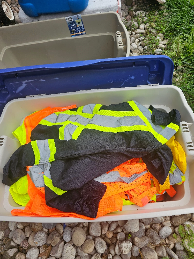 Selling a mixed lot of hi-visibility safety gear. Includes vests, jackets, and other items. Perfect for construction, road work, or any job requiring high visibility. All in good condition and ready for use!
