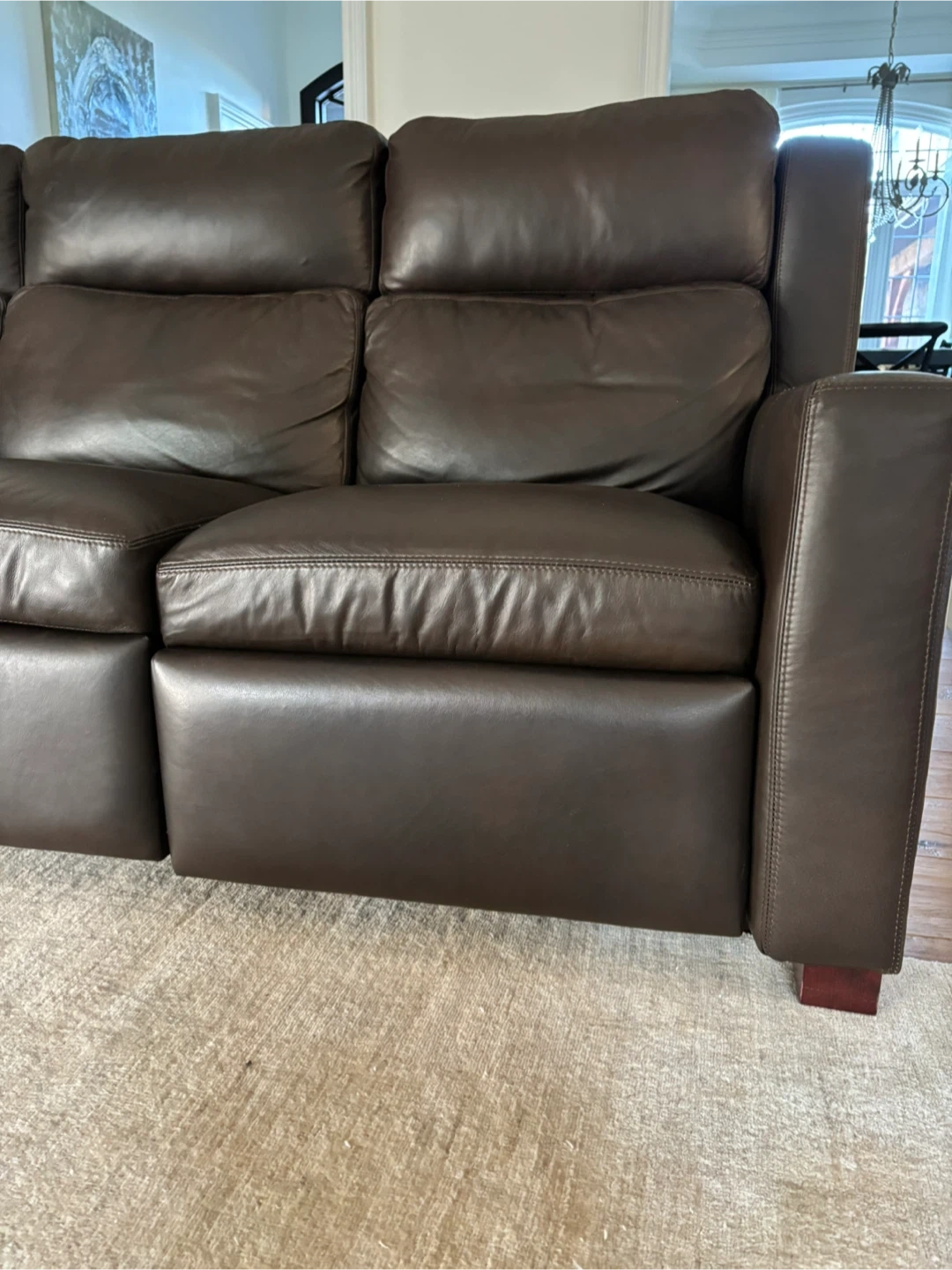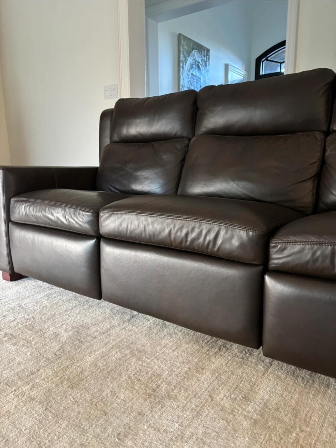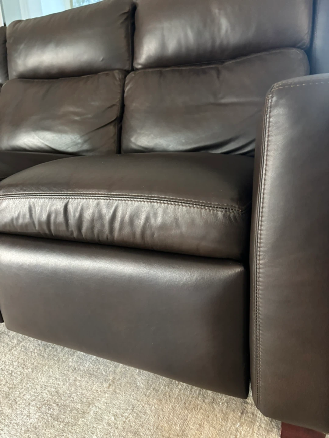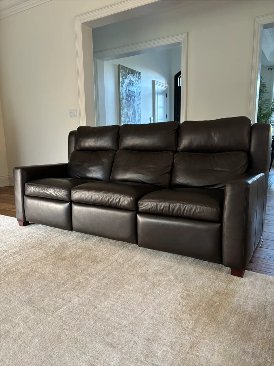 HIGH END CUSTOM MADE POWER RECLINERS RECLINE FULLY AGAINST A WALL UPGRADED LEATHER HEADCRESTS RECLINE MADE BY CRITELLI FURNITURE IN ST CATHERINES
