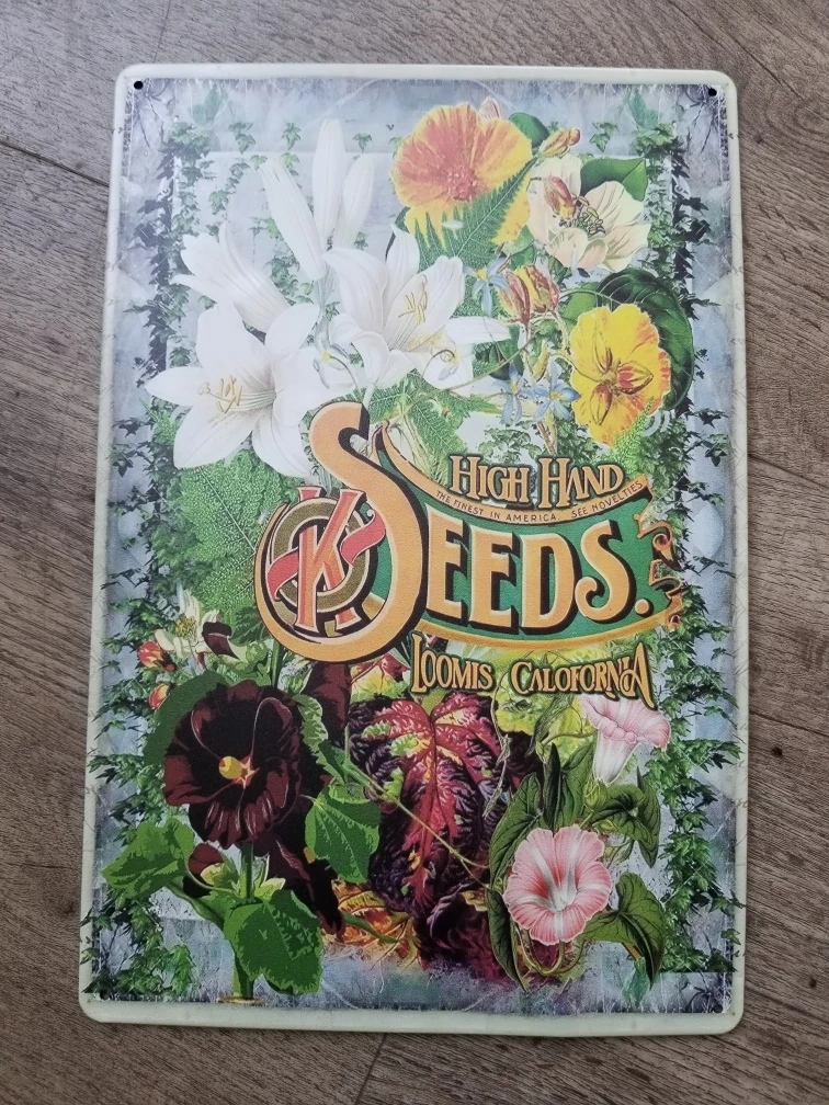 Vintage-style metal sign featuring a floral design and the "High Hand Seeds" logo. Perfect for adding a touch of rustic charm to your home or garden decor. Brand new 8x12