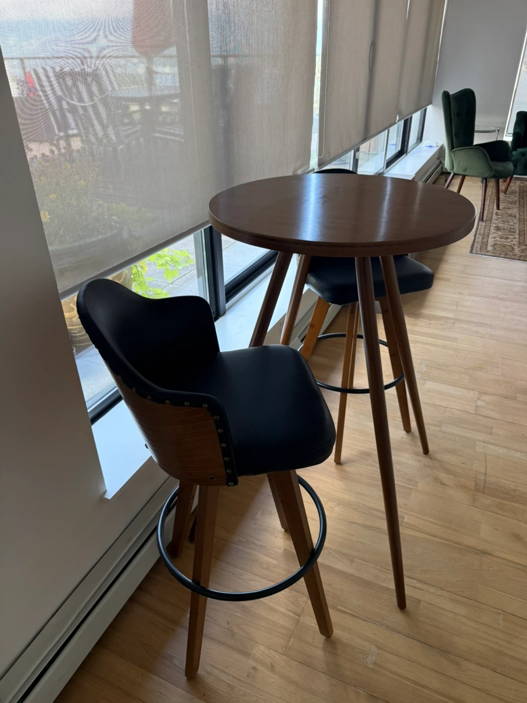 Selling a high top table with two matching stools. The table has a round, dark wood top and the stools feature black leather seats with wooden legs. Perfect for a small dining area or kitchen!