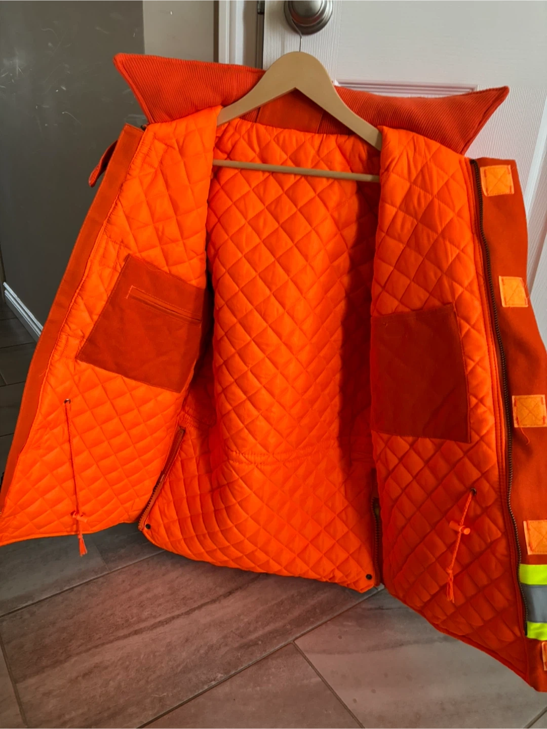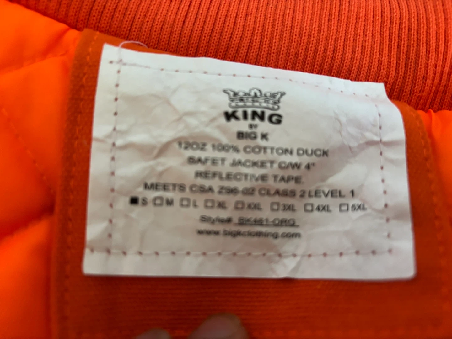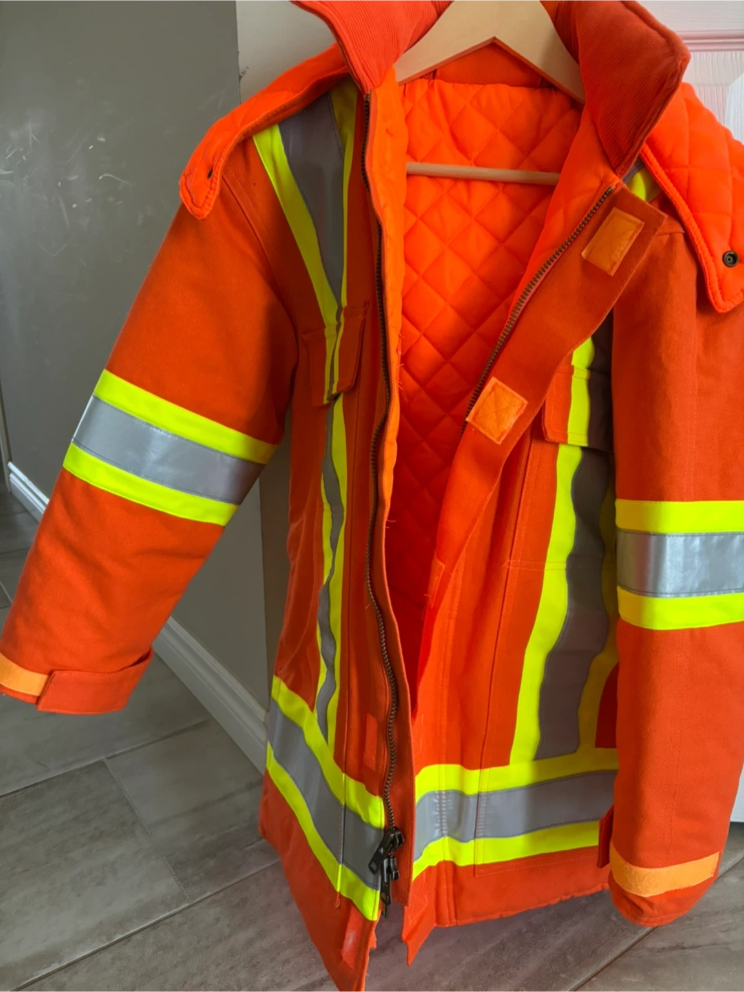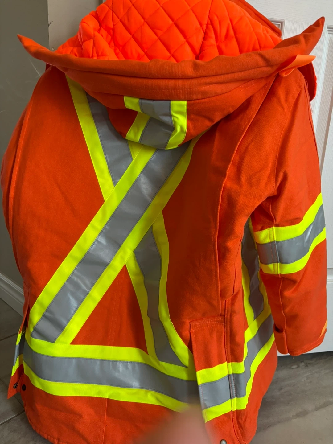 Selling a high vis winter jacket. It's made of 100% cotton duck and has reflective tape. Meets CSA Z96-02 Class 2 Level 1 standards. Perfect for staying visible and safe!