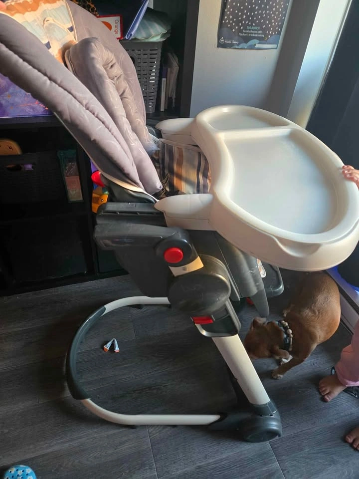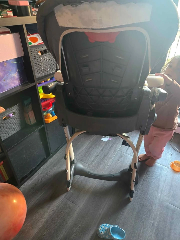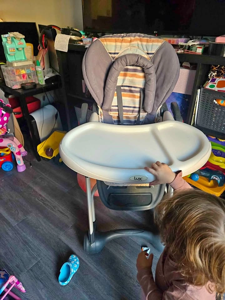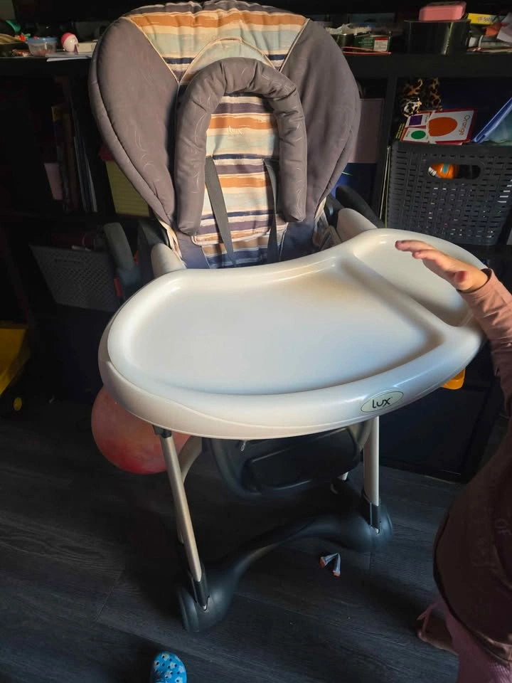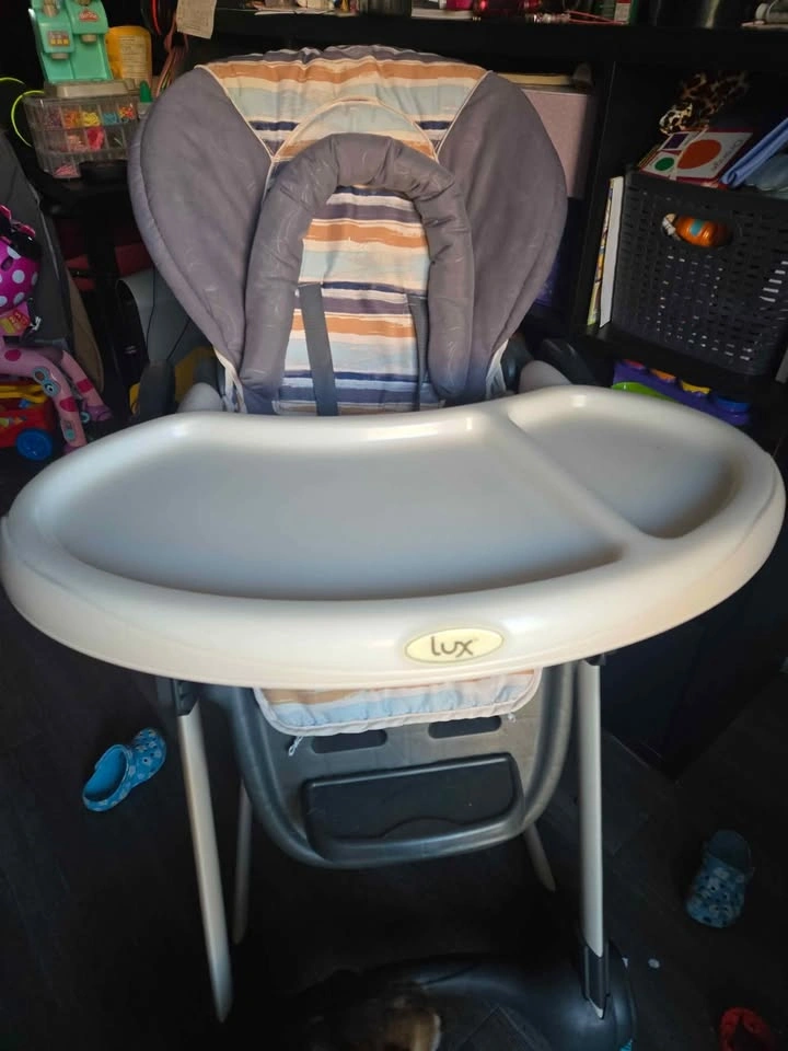 Great condition, removable tray, adjustable foot rest, five point harness, and infant head insert.