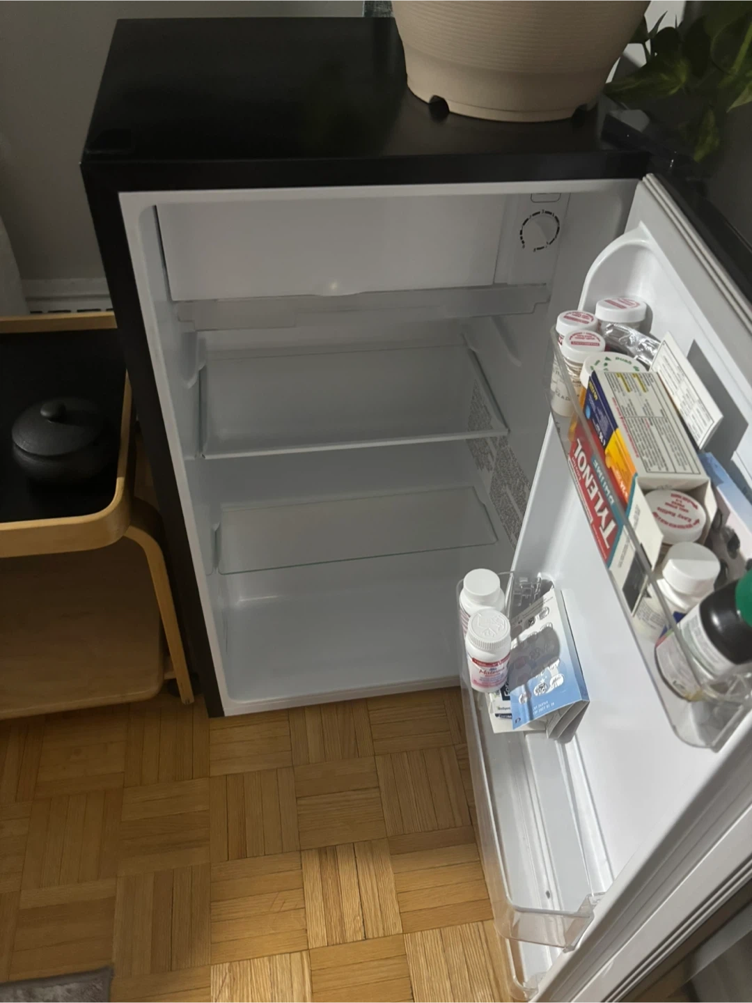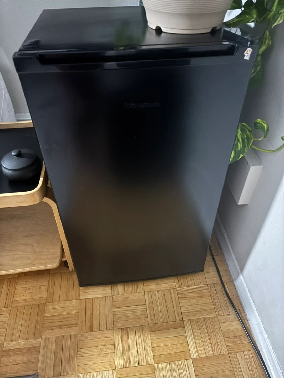 Selling a Hisense mini fridge in black. It's perfect for a dorm room, office, or small apartment. It's in great condition and ready to keep your drinks and snacks cold