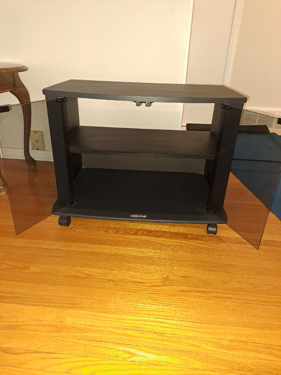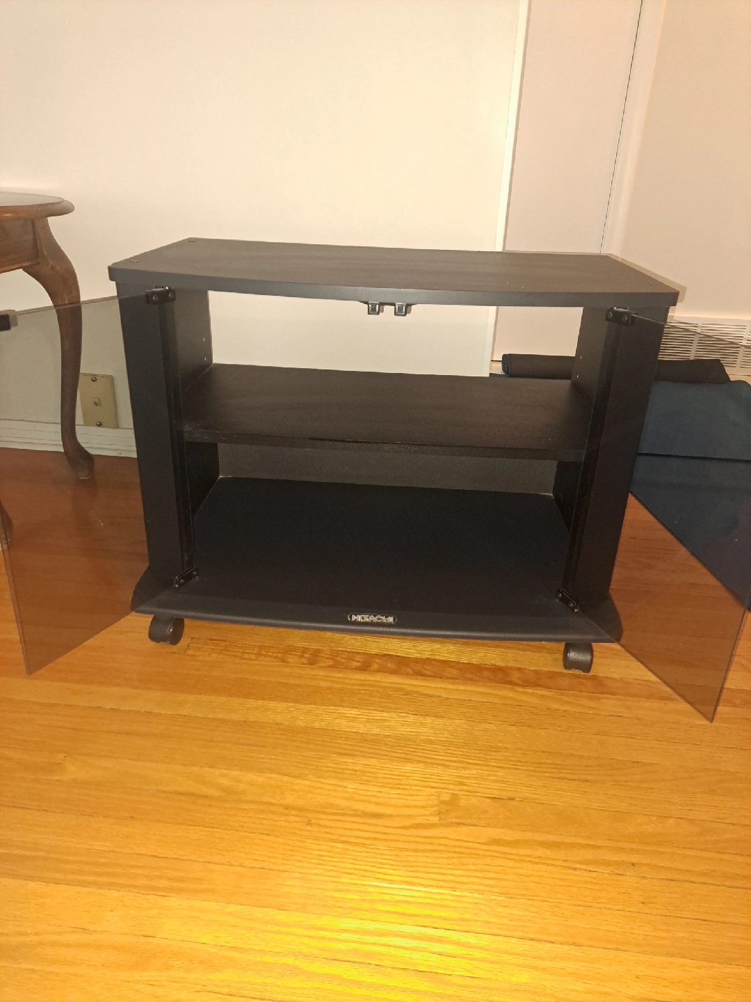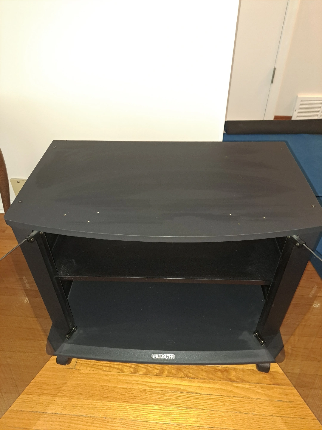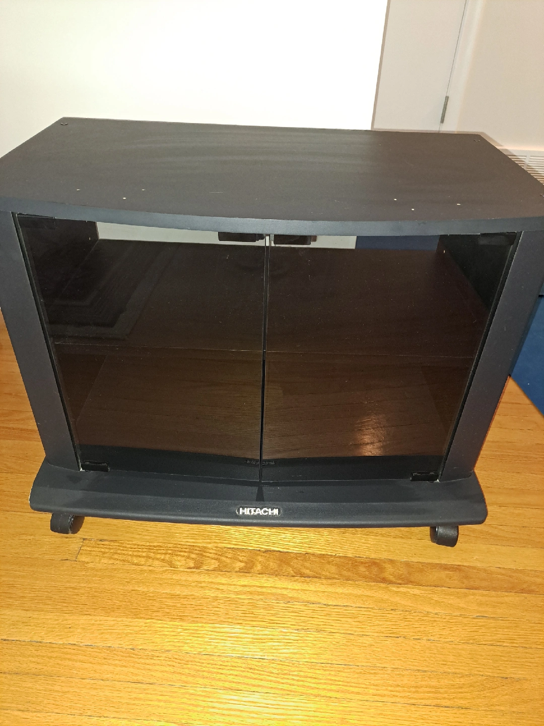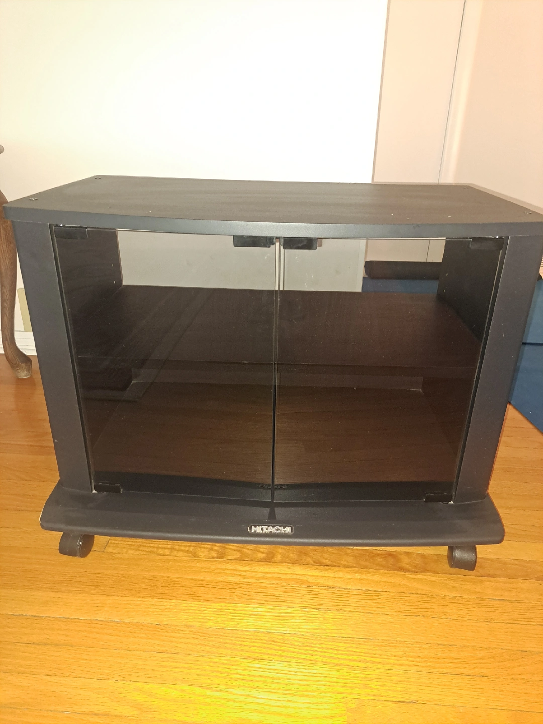 Selling a black TV stand by Hitachi. It features glass doors and a shelf inside, perfect for storing your media devices or other items. The stand is in good condition and ready for a new home! 19.5"tall x 26.5" wide x 16" deep Killarney area non smoking home cash only