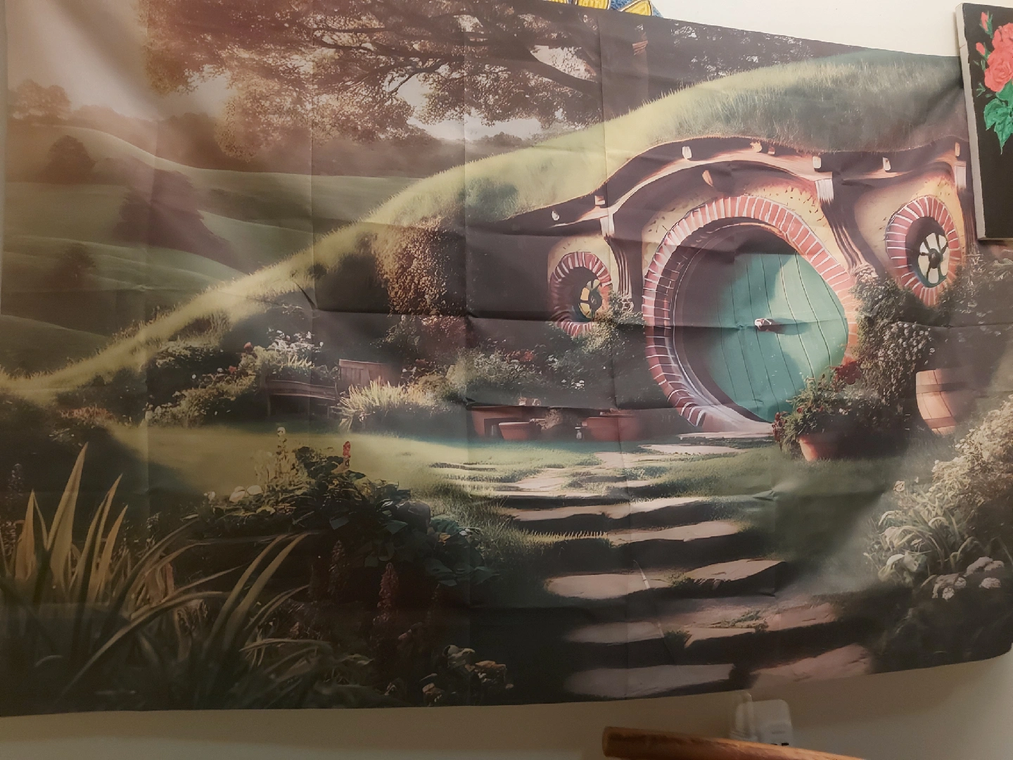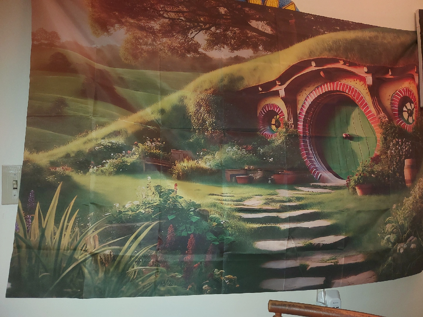 fabric hobbit backdrop used once, like new. two small pinholes on top corners from where we pinned it. good for birthday theme or room decoration . free balloons if picked up this week (unsure how long before they deflate but so far so good!) can meet around commercial or robson square area.